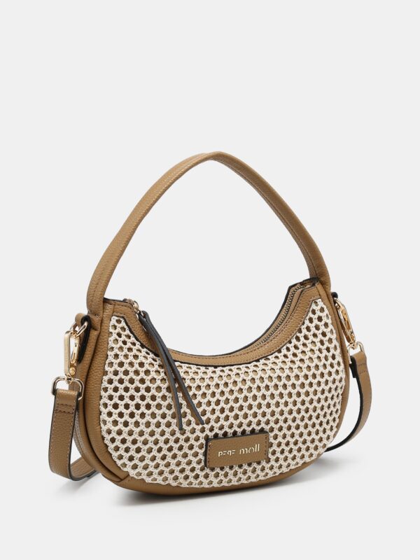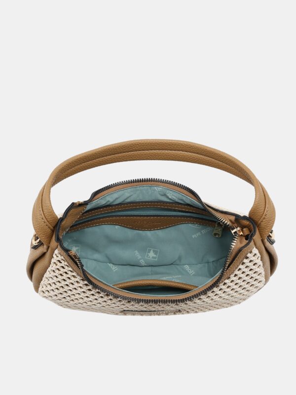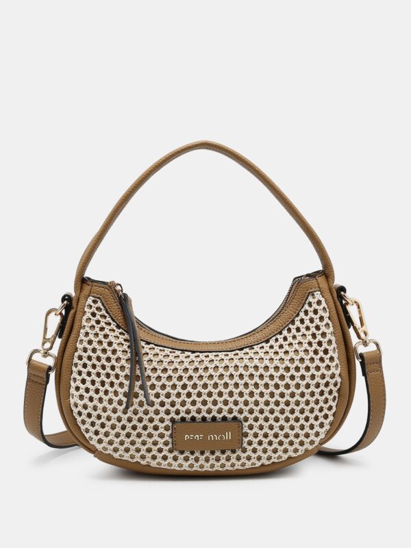 Bolso pequeño, de la firma Pepe Moll, fabricado en rafia en forma de malla sobre tejido de saco. Modelo diseñado con cierre superior de cremallera y dos asas: una corta para llevarlo en la mano o al brazo y una correa larga, ajustable y extraíble, para lucirlo de bandolera. En su interior cuenta con dos bolsillos que permiten guardar las cosas mas pequeñas. Destaca su forma en media luna que aporta un toque sofisticado para lucirlo con cualquier look veraniego.
