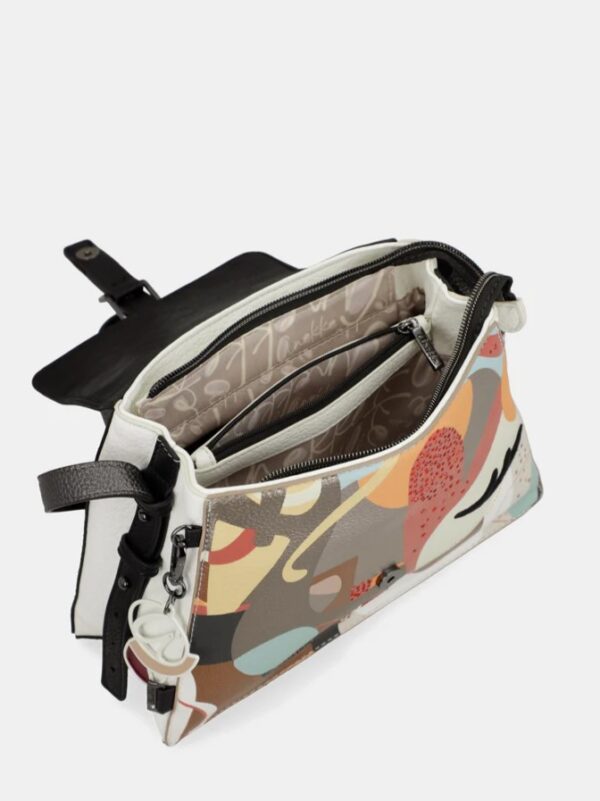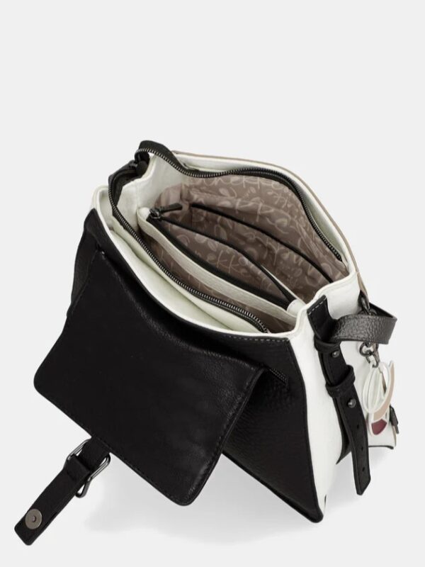 Bolso, tamaño pequeño, diseñado con solapa y cierre superior de cremallera. Modelo para llevar cruzado gracias a la correa larga ajustable a diferentes largos mediante enganches en los extremos. En su interior encontramos un bolsillo central, cerrado con cremallera, que hace de separador de dos compartimentos de mayor tamaño. Cuenta con un bolsillo exterior, cerrado con cremallera, en la parte de detrás, así como dos más en su interior para llevar organizadas las pequeñas cosas que necesitas a diario.