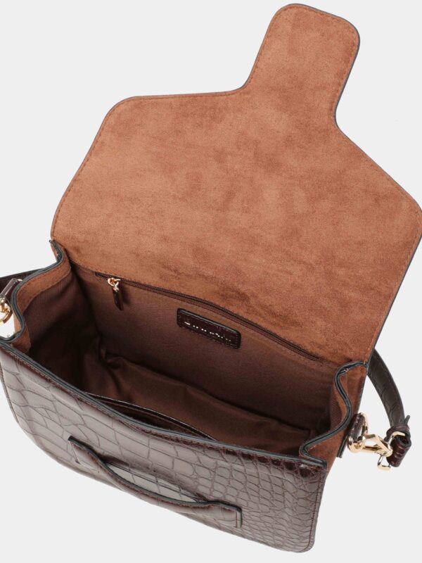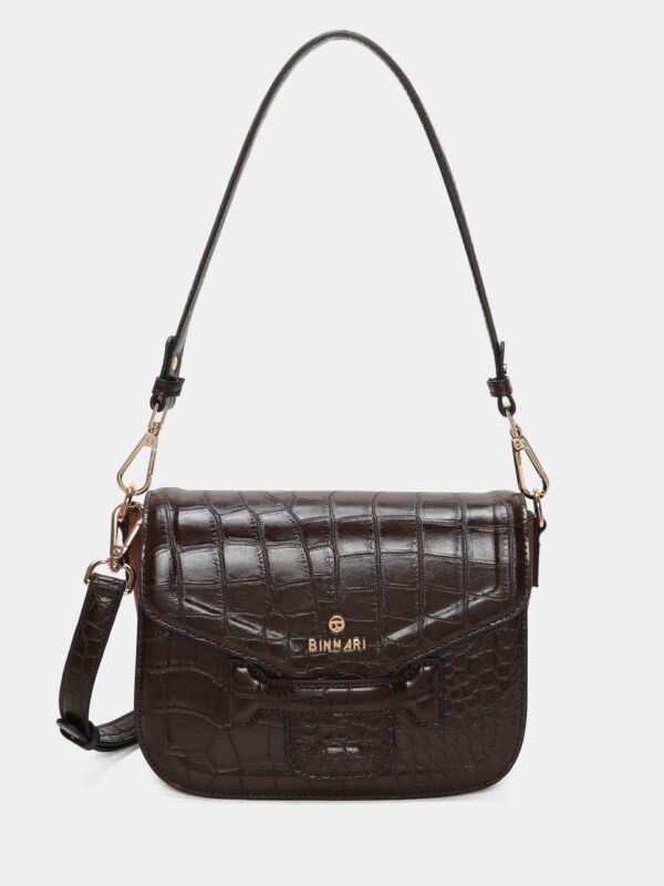 Bolso estilo bandolera de la firma Binnari, confeccionado en coco sintético, con cierre de solapa con pasador. Modelo diseñado con dos correas ajustables y extraíbles: una corta para llevar al hombro y otra larga para que puedas llevarlo de bandolera. También dispone de dos bolsillos en su interior, uno cerrado con cremallera, para llevar a a mano esas pequeñas cosas del día a día.