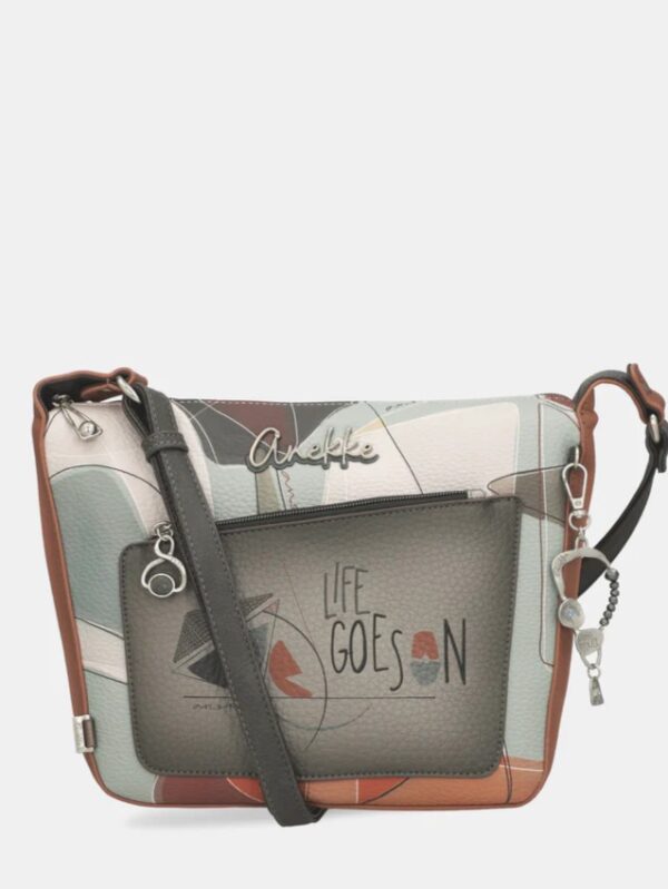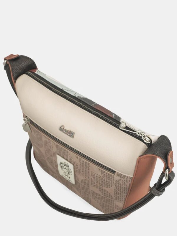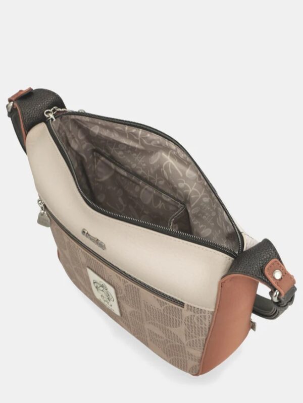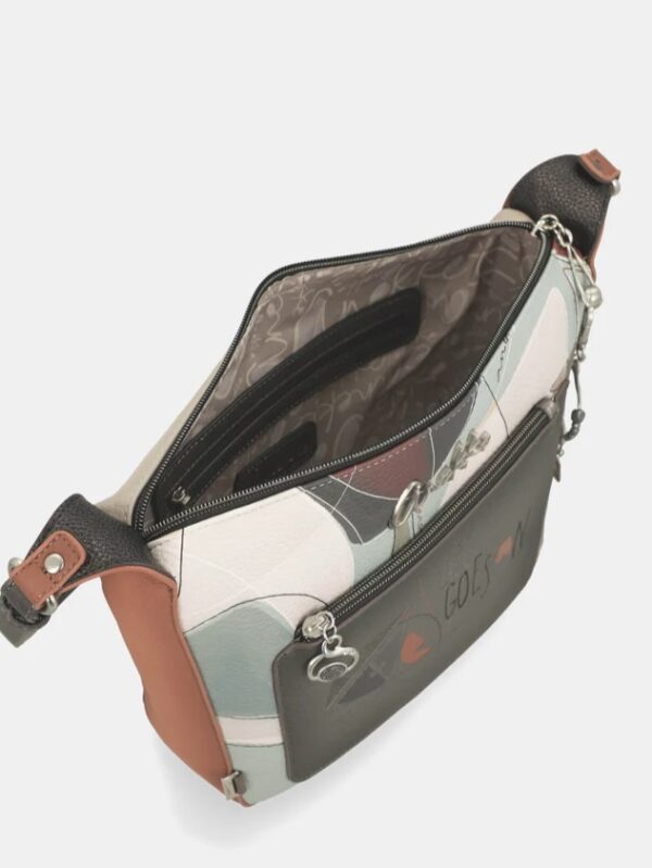 Bolso de tamaño medio, estilo bandolera, con cierre superior de cremallera y diseñada con una correa larga graduable para un ajuste personal. Este modelo cuenta con dos bolsillos exteriores, uno por delante y otro en la parte de detrás, cerrados con cremallera, y en su interior encontramos tres mas para llevar a mano las cosas mas pequeñas del día a día. Su tamaño, sin ser muy grande, te permite portar todo lo necesario al salir de casa.