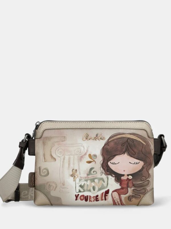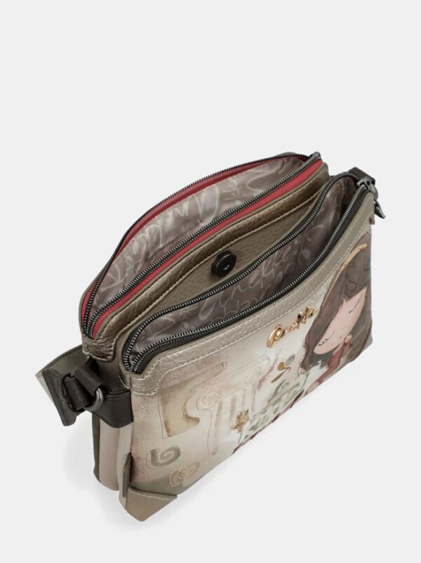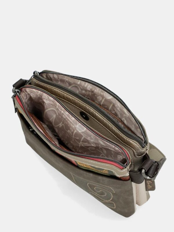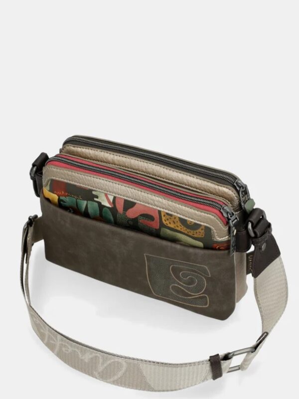 Bolso, tamaño pequeño, diseñado con dos compartimentos independientes de cierre superior con cremallera y uno central con cierre de botón de imán. Modelo para llevar cruzado gracias a la correa larga, ajustable a diferentes largos, que dispone. Cuenta con un bolsillo exterior cerrado con cremallera en la parte de detrás, así como tres más en su interior para llevar organizadas las pequeñas cosas que necesitas a diario.