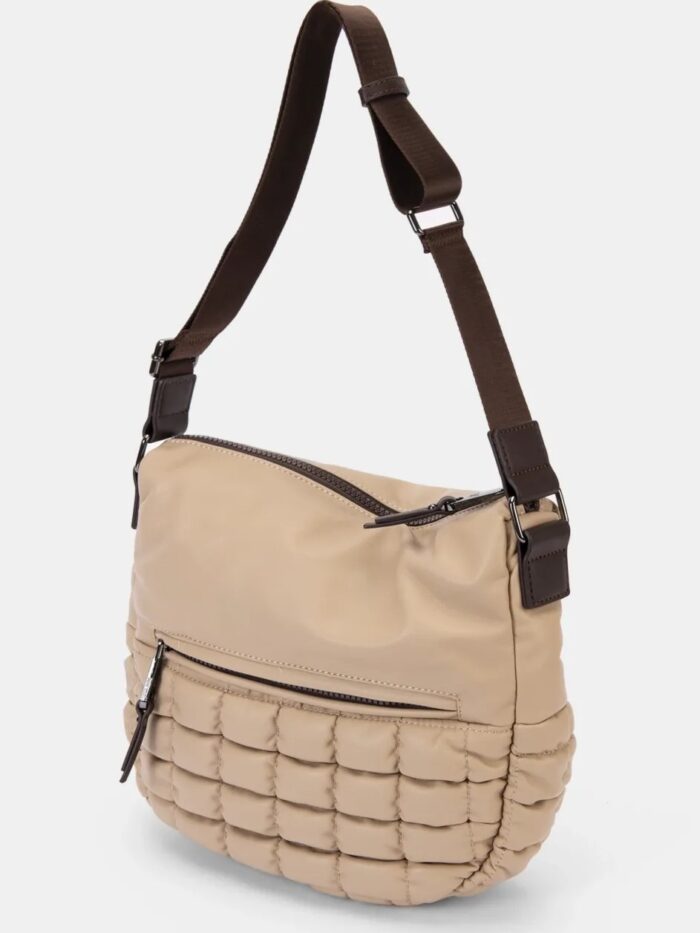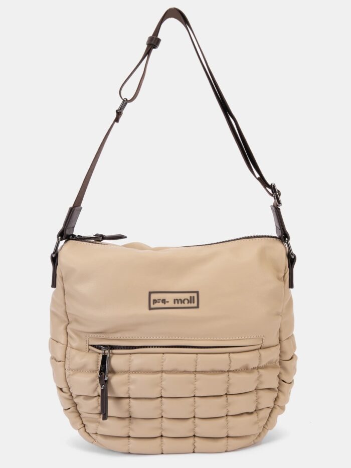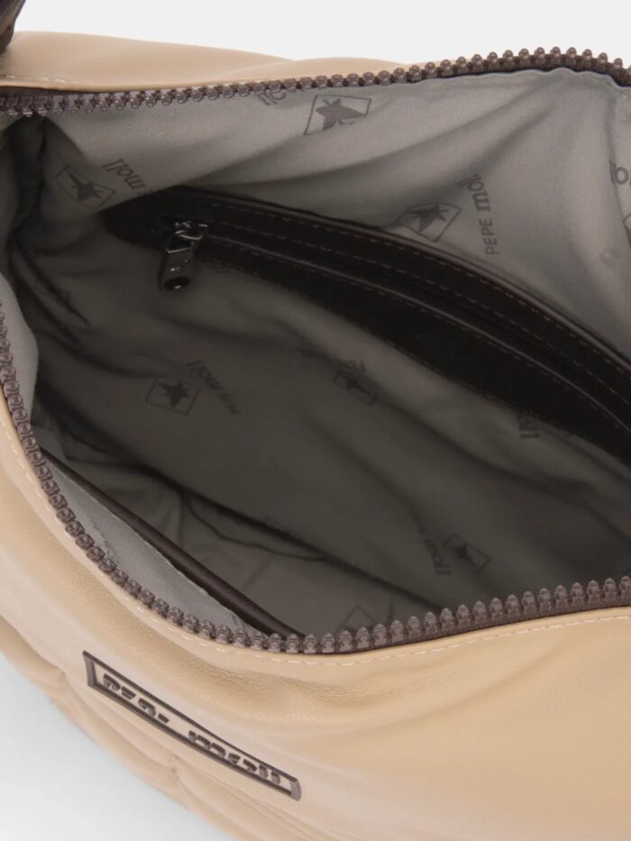Bolso estilo bandolera, tamaño medio, de la firma Pepe Moll. Modelo de diseño acolchado, con dos bolsillos exteriores, uno delante y otro detrás, cerrados con cremallera y dos más en su interior. Gracias a su correa regulable, puedes llevarlo al hombro o cruzado, adaptándose a tu estilo y necesidad.