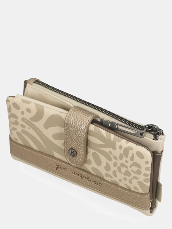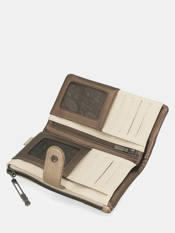 Billetero, tamaño medio-grande, de gran capacidad tanto para billetes y tarjetas por un lado, cerrado con solapa estrecha de clip, como para monedas, por otro, con cierre de cremallera.