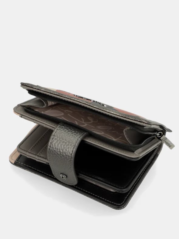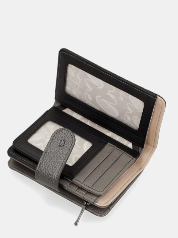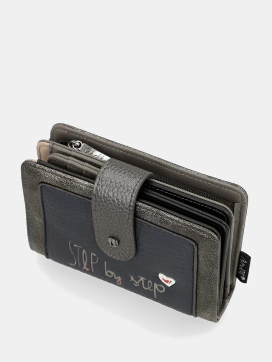 Billetero de tamaño medio con gran capacidad tanto para billetes y tarjetas por un lado, cerrado con clip, como para monedas, por otro lado, con cierre de cremallera.