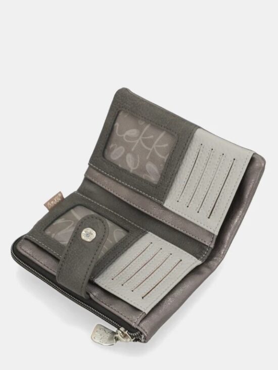 Billetero, tamaño medio, de textura «blanda» y con gran capacidad tanto para billetes y tarjetas por un lado, que se cierra con solapa estrecha de clip, como para monedas, por otro lado, con cierre de cremallera. Modelo de tamaño y capacidad ideales para acompañarte dentro del bolso o mochila que elijas y llevar todo lo que necesites totalmente organizado.