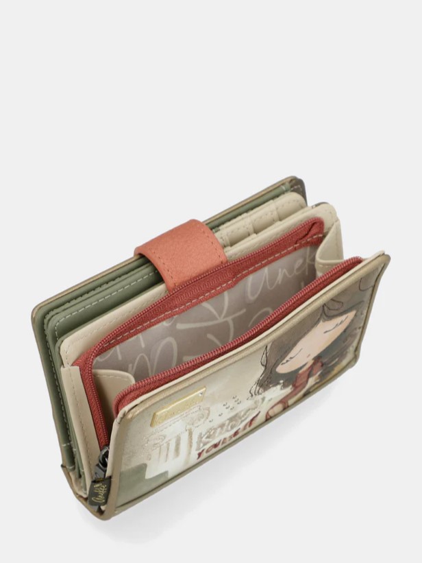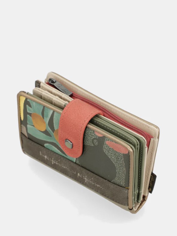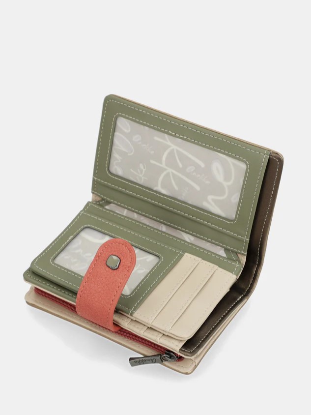 Billetero, tamaño medio, con gran capacidad tanto para billetes y tarjetas por un lado, cerrado con clip, como para monedas por otro con cierre de cremallera.