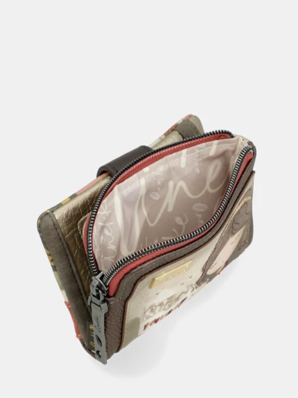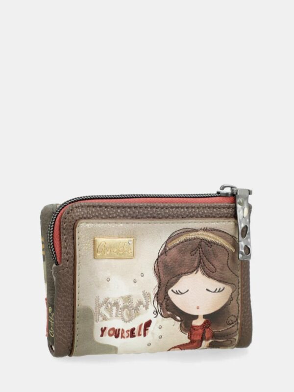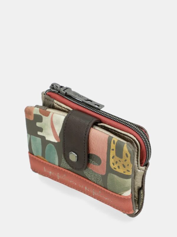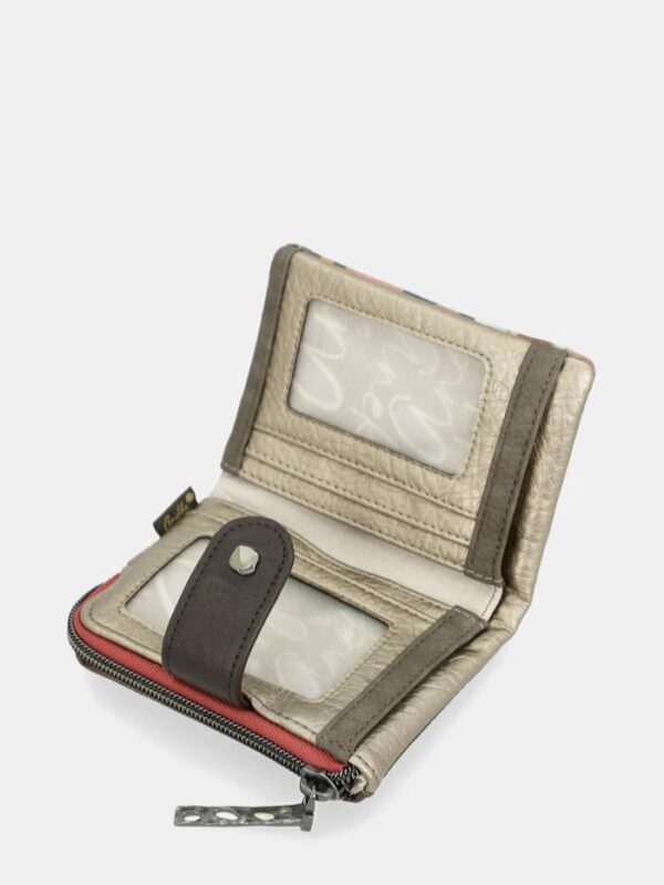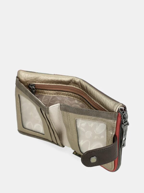 Billetero pequeño con capacidad tanto para billetes y tarjetas por un lado, cerrado con solapa estrecha de clip, como para monedas, por otro, con cierre de cremallera.