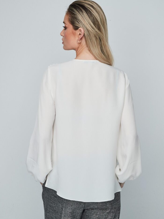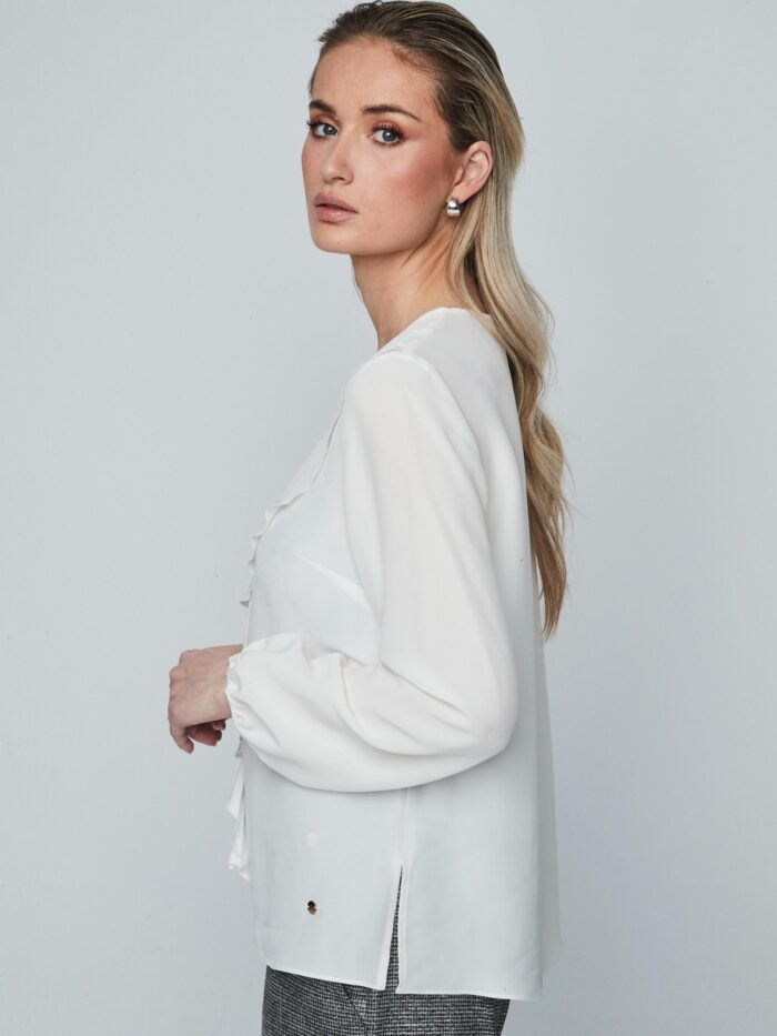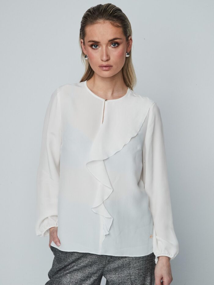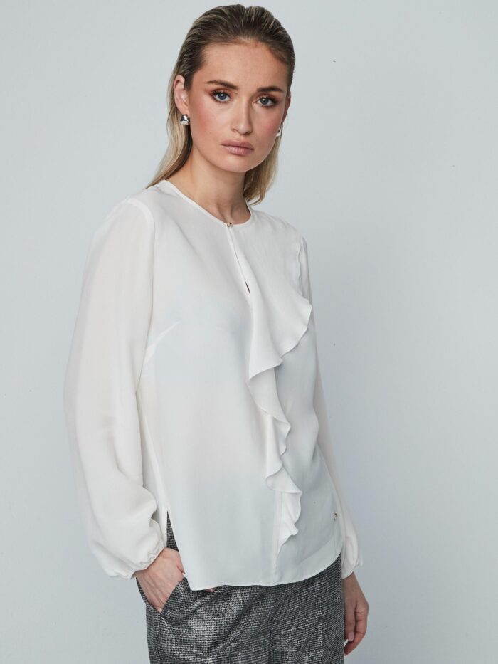 Blusa en color blanco, de apariencia gasa, de manga larga con cuello redondo. Modelo abotonado por delante, en el cuello, con una ligera abertura. Detalle de volante asimétrico delantero, desde el hombro hasta la cintura, y pequeñas aberturas laterales en el bajo. Elástico en los puños.