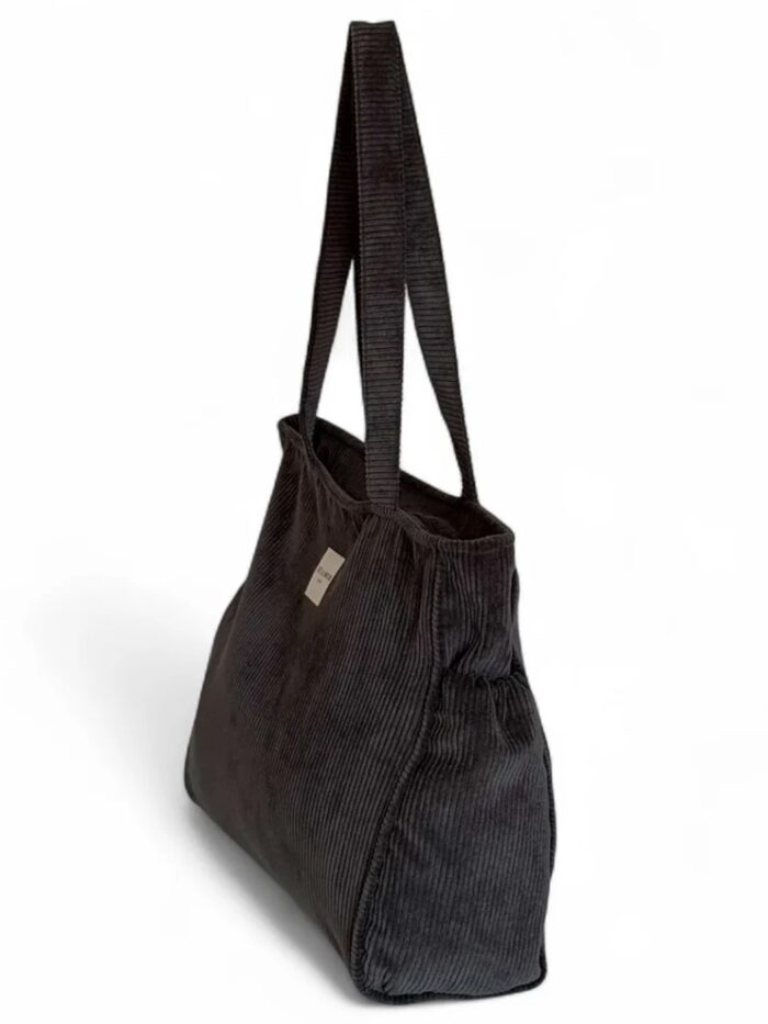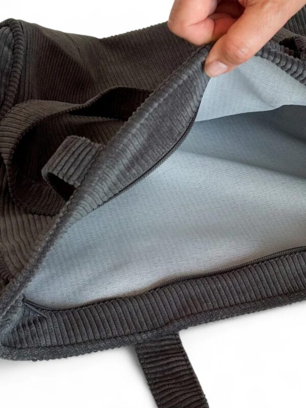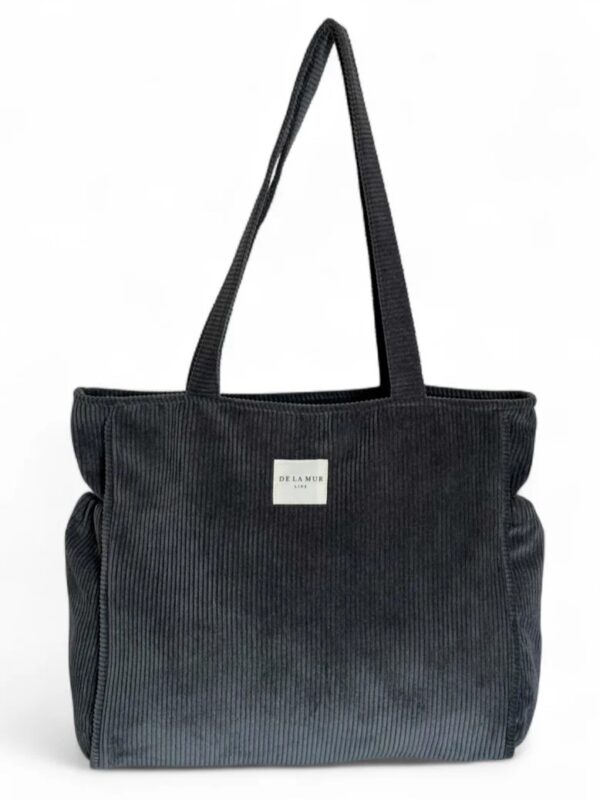 Bolsa, tamaño medio/grande, con cierre de cremallera en la parte superior y asas amplias para llevar al hombro. Modelo confeccionado con tejido grueso de pana de color gris oscuro. Cuenta con bolsillos laterales ideales para llevar mas a mano pequeñas cosas del día a día. Confeccionada con telas nacionales.