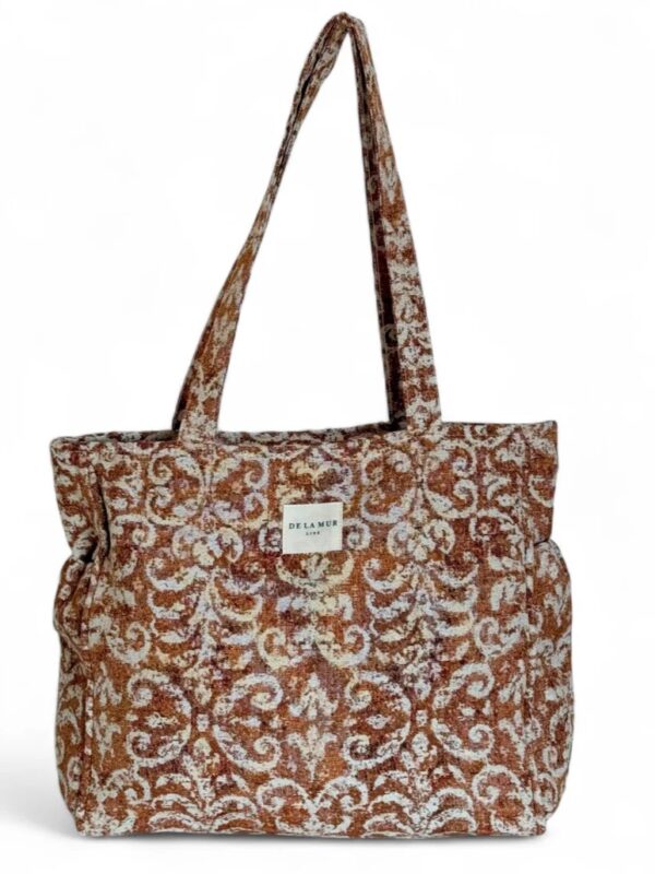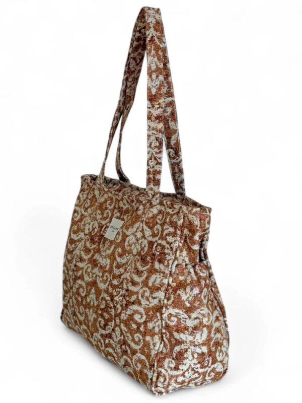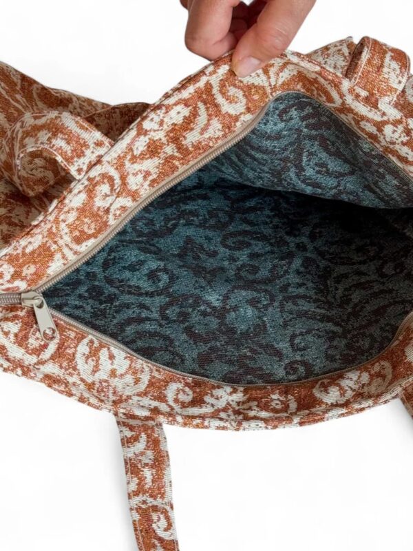 Bolsa, tamaño medio/grande, con cierre de cremallera en la parte superior y asas amplias para llevar al hombro. Modelo confeccionado con tejido grueso de jacquard con estampado geométrico de color teja. Cuenta con bolsillos laterales ideales para llevar mas a mano pequeñas cosas del día a día. Confeccionada con telas nacionales.