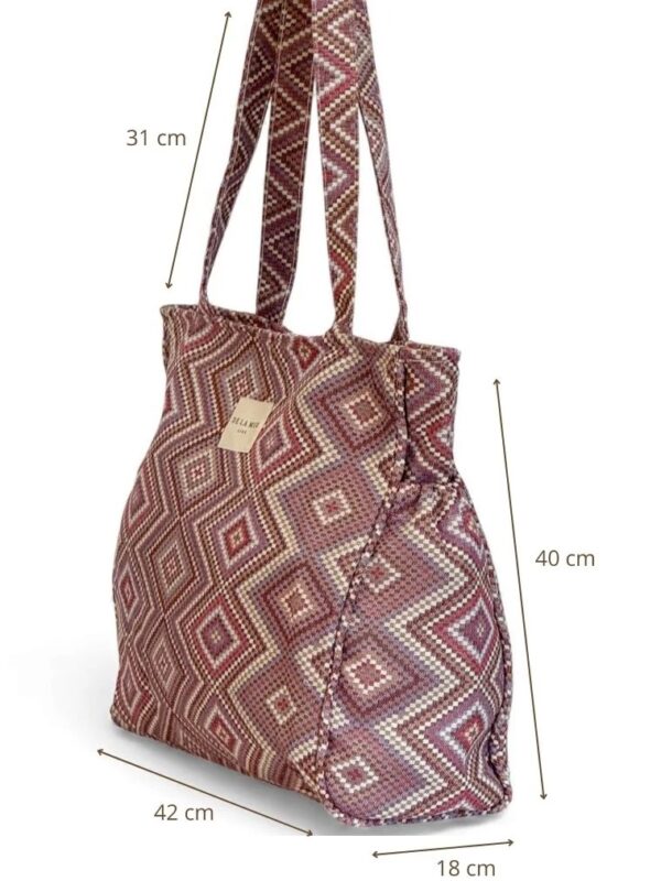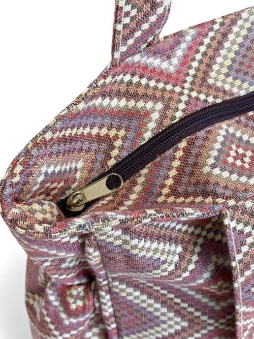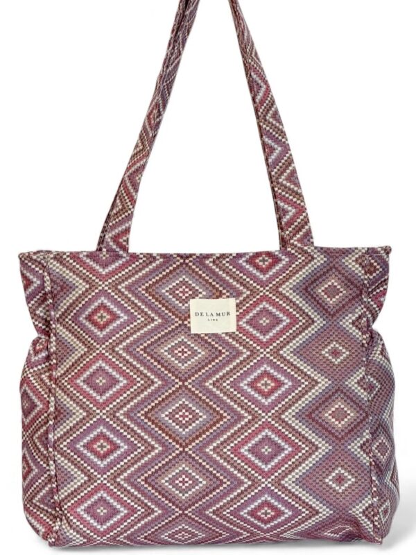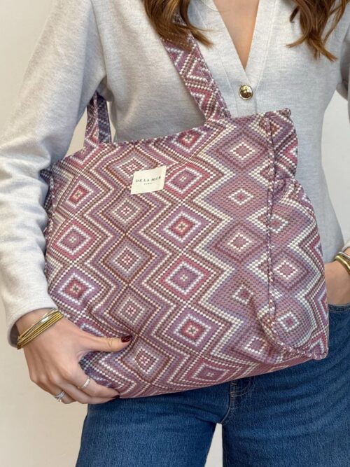 Bolsa, tamaño grande, con cierre de cremallera en la parte superior y asas amplias para llevar al hombro. Modelo confeccionado con tejido grueso de jacquard (80% algodón y 20% poliéster) con estampado geométrico en tonos rosados y lilas. Cuenta con bolsillos laterales ideales para llevar mas a mano pequeñas cosas del día a día. Confeccionada con telas nacionales.