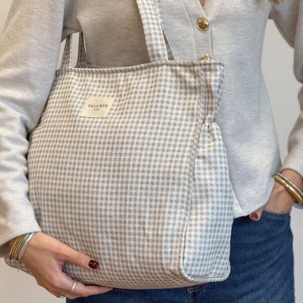 Bolsa, tamaño grande, con cierre de cremallera en la parte superior y asas amplias para llevar al hombro. Modelo confeccionado con tejido grueso de jacquard (80% algodón y 20% poliéster) con estampado a cuadros vichy en tono beige y crudo. Cuenta con bolsillos laterales ideales para llevar mas a mano pequeñas cosas del día a día. Confeccionada con telas nacionales.