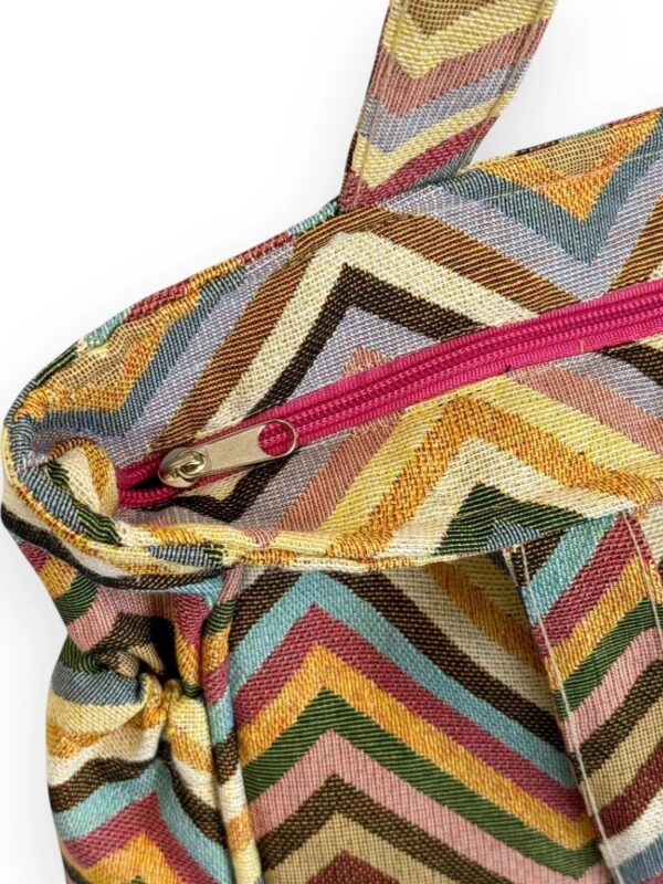 Bolsa, tamaño grande, con cierre de cremallera en la parte superior y asas amplias para llevar al hombro. Modelo confeccionado con tejido grueso de jacquard (80% algodón y 20% poliéster) con estampado tipo zigzag multicolor. Cuenta con bolsillos laterales ideales para llevar mas a mano pequeñas cosas del día a día. Confeccionada con telas nacionales.