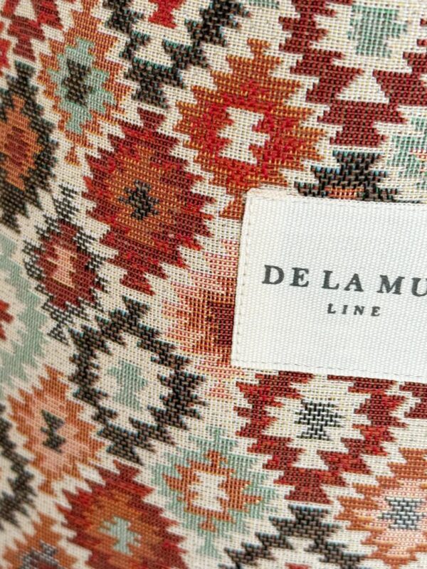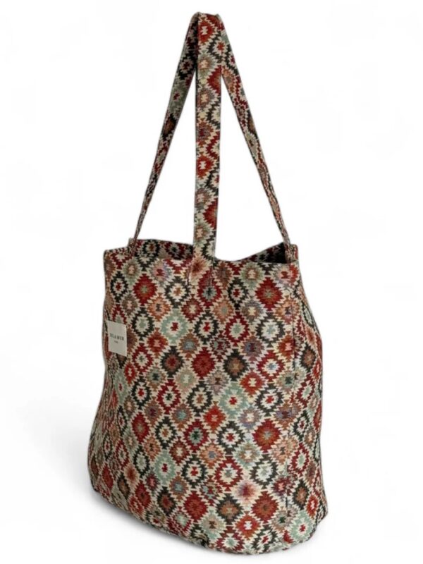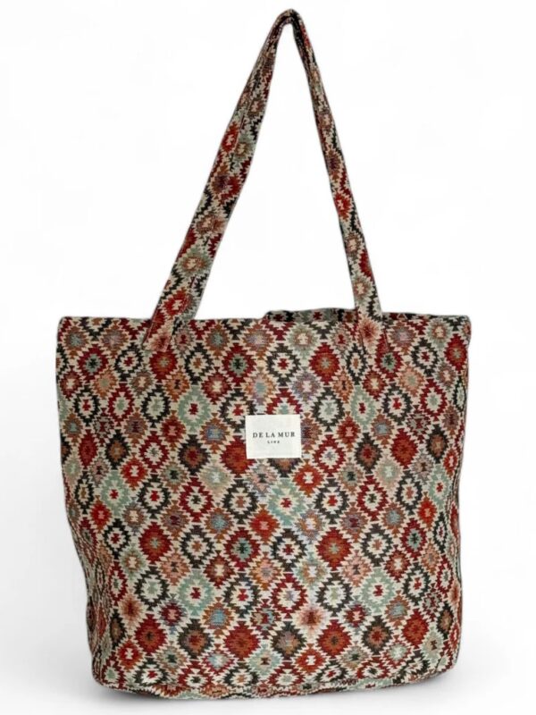 Bolsa shopper, tamaño grande, confeccionada con tejido grueso de jacquard con estampado geométrico multicolor. Modelo con asas amplias para llevarla cómodamente al hombro. Confeccionada con telas nacionales.