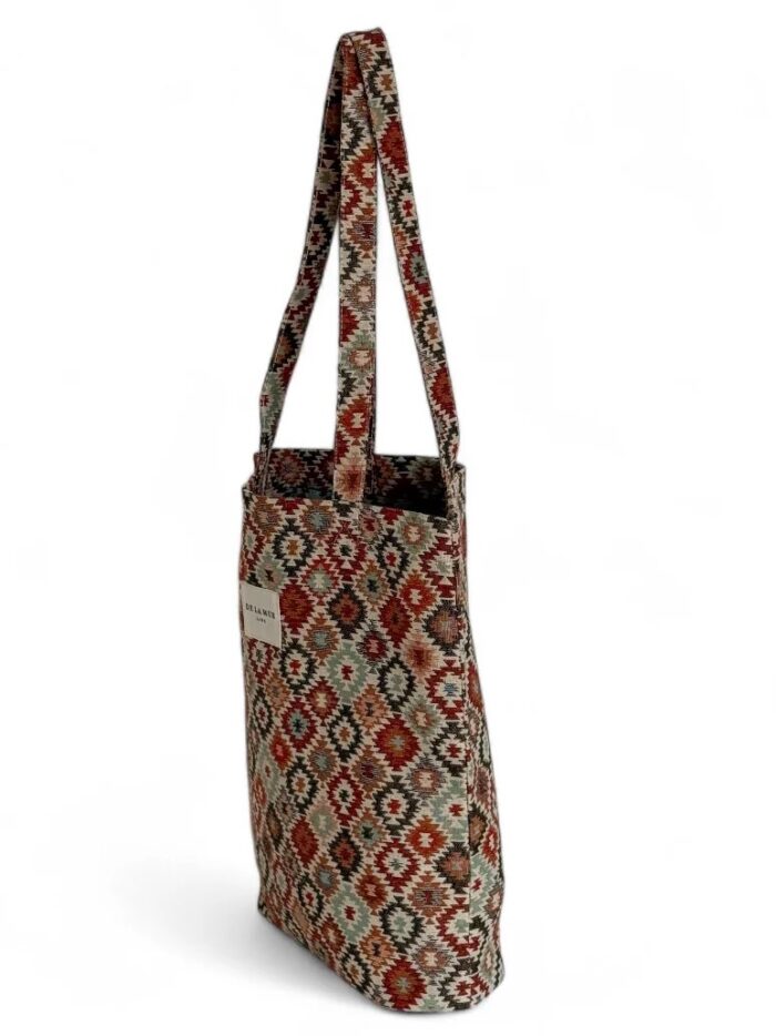 Bolsa «tote bag», tamaño medio, confeccionado con tejido grueso de jacquard con estampado geométrico multicolor. Modelo con asas para llevar al hombro, ideal para llevar libretas, agenda, alguna prenda de ropa, muy cómoda para el día a día. Confeccionado con telas nacionales.