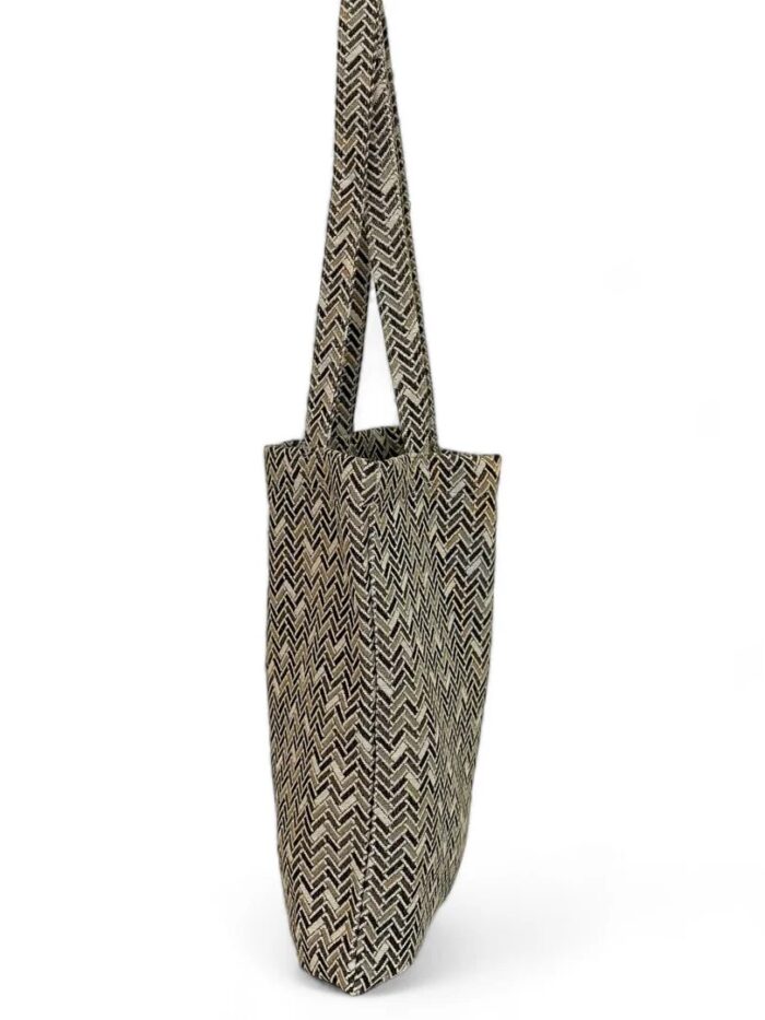 Bolsa «tote bag», tamaño medio, confeccionado con tejido grueso de jacquard con estampado en zig zag. Modelo con asas para llevar al hombro, ideal para llevar libretas, agenda, alguna prenda de ropa, muy cómoda para el día a día. Confeccionado con telas nacionales.