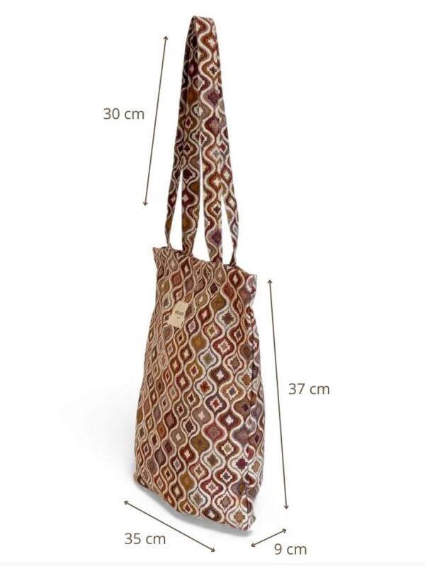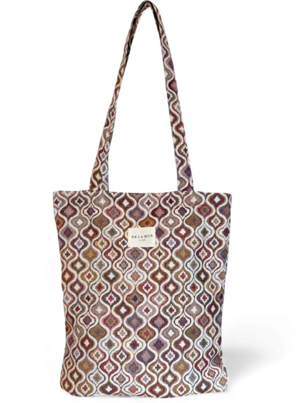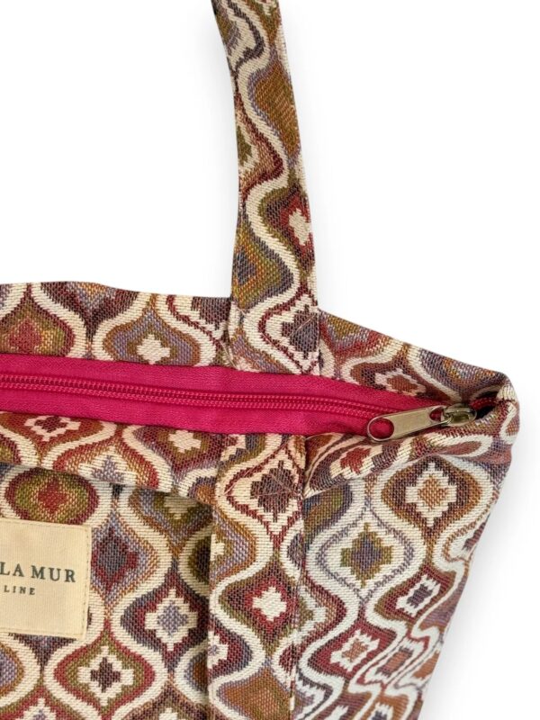 Bolsa «tote bag», tamaño medio, confeccionado con tejido grueso de jacquard (80% algodón y 20% poliéster) con estampado geométrico en tonos rosados y lilas. Modelo cerrado con cremallera y diseñado con dos asas amplias para llevar al hombro. Ideal para llevar libretas, agenda, alguna prenda de ropa…., muy cómoda para el día a día. Confeccionado con telas nacionales.