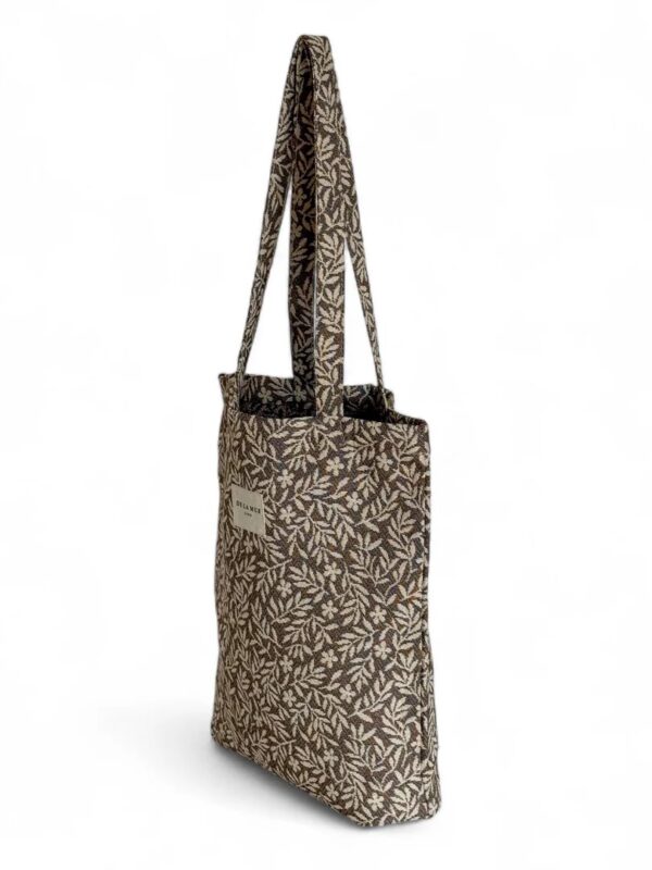 Bolsa «tote bag», tamaño medio, confeccionado con tejido grueso de jacquard con estampado floral en tono crudo sobre fondo beige. Modelo con asas para llevar al hombro, ideal para llevar libretas, agenda, alguna prenda de ropa, muy cómoda para el día a día. Confeccionado con telas nacionales.