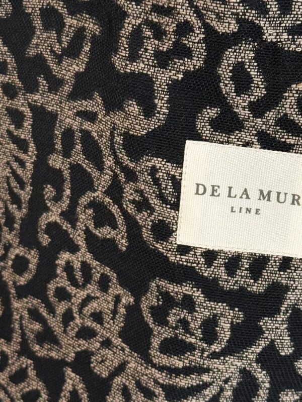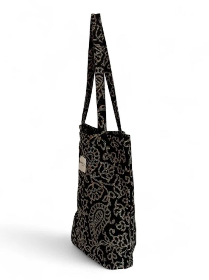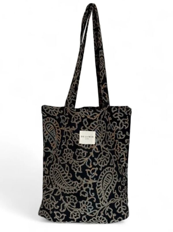 Bolsa «tote bag», tamaño medio, confeccionado con tejido grueso de jacquard con estampado floral de color gris sobre fondo negro. Modelo con asas para llevar al hombro, ideal para llevar libretas, agenda, alguna prenda de ropa, muy cómoda para el día a día. Confeccionado con telas nacionales.