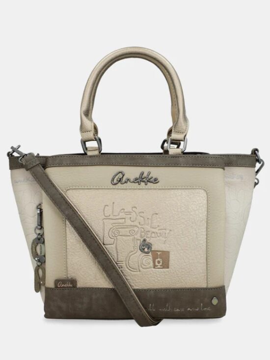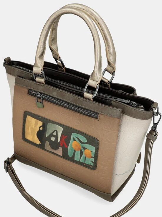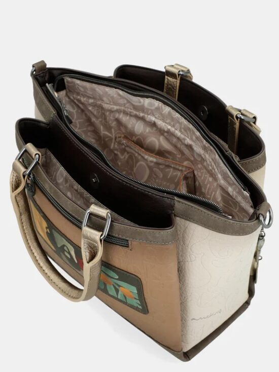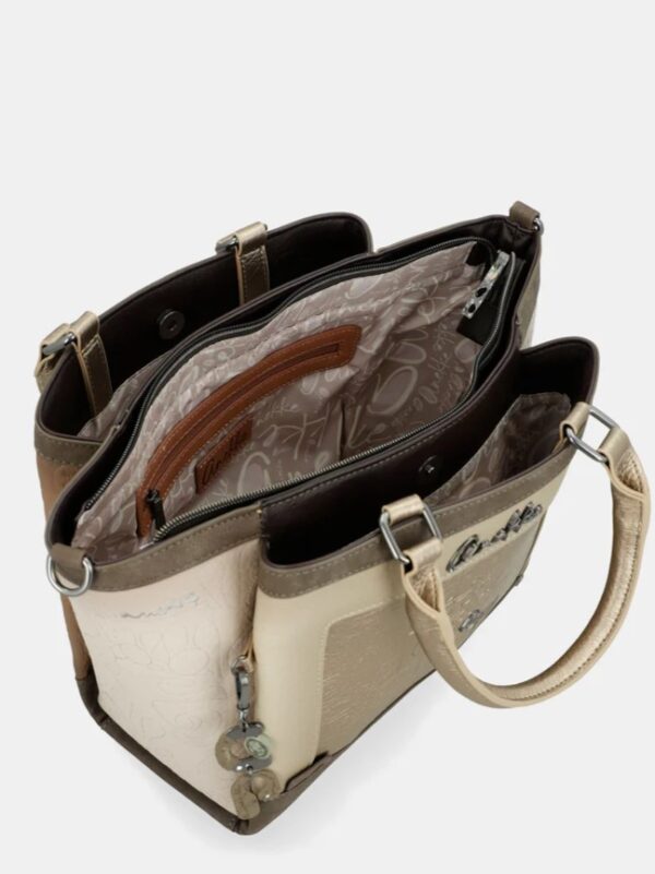 Bolso tamaño medio-grande, con tres compartimentos independientes, el central mas amplio y cerrado con cremallera y dos laterales cerrados con botón de imán. Modelo diseñado con dos asas cortas para llevar de mano y posibilidad de llevar cruzado gracias a la correa larga, ajustable y extraíble, que incorpora. Dispone de un bolsillo exterior, por delante, así como tres más en su interior para llevar organizadas esas pequeñas cosas.