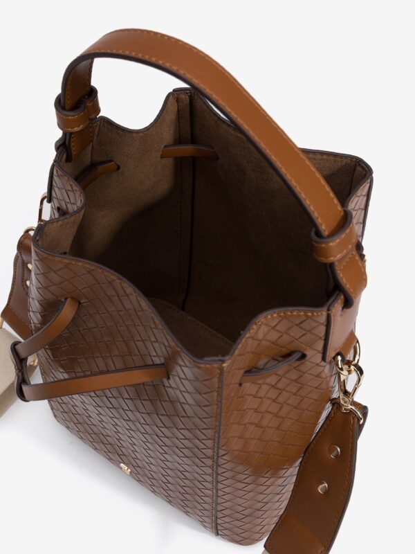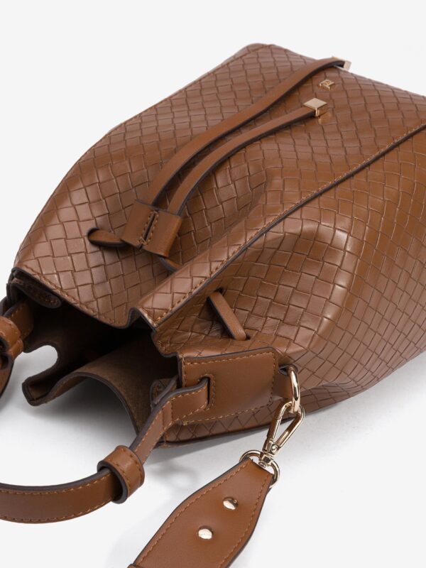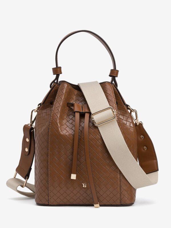 Bolso marrón de tamaño medio, con textura entrelazada, de la firma Tiffosi. Modelo con cierre de cordón y diseñado con una asa corta para llevar en la mano y otra, ajustable y extraíble, para lucir de bandolera.