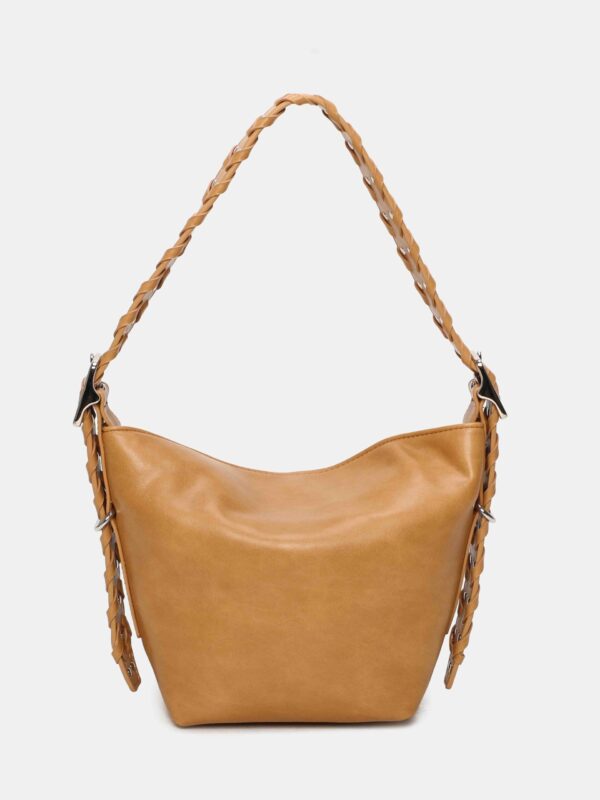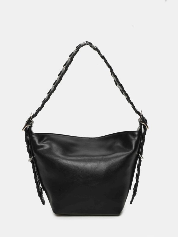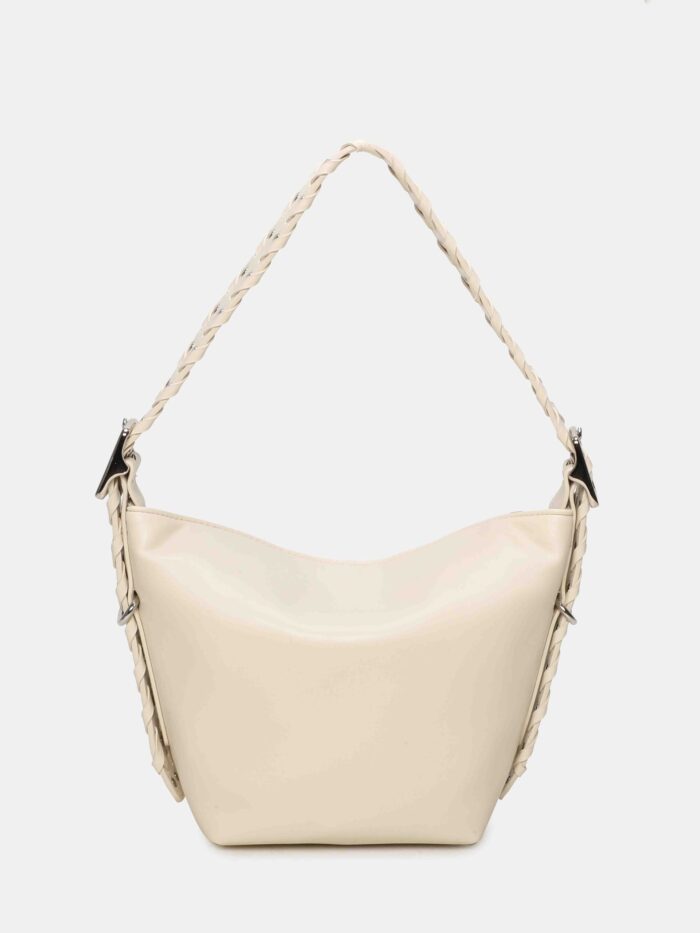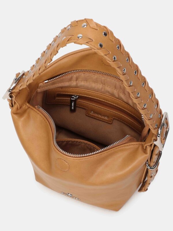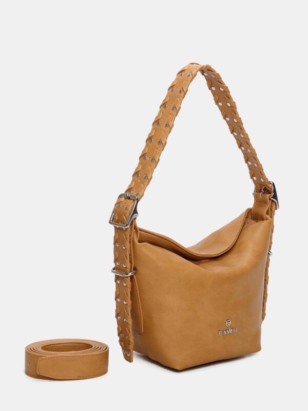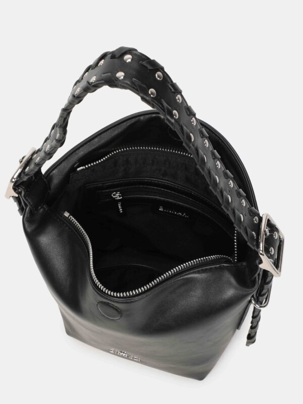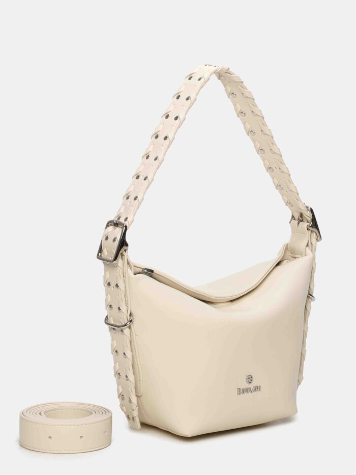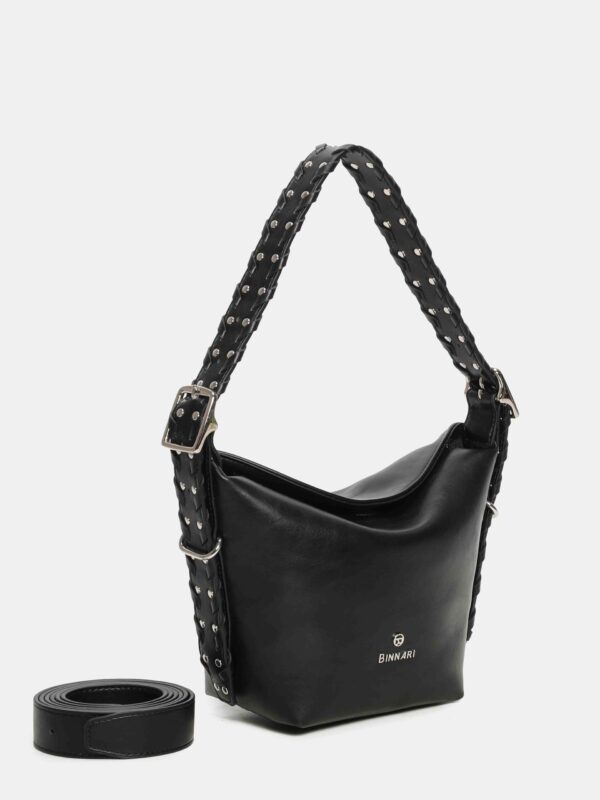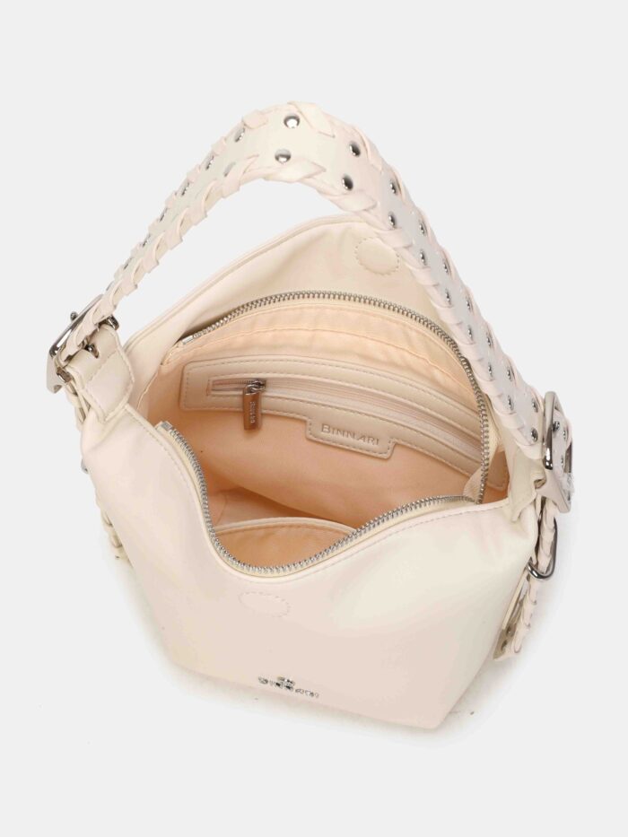 Bolso pequeño, de la firma Binnari, diseñado con cierre superior de cremallera complementado con uno magnético para mas seguridad. Cuenta con una correa corta, trenzada y decorada con tachas, que se puede regular en altura mediante hebillas y permite lucirlo tanto en la mano como al hombro y también una correa larga, ajustable y extraíble, para llevarlo de bandolera. En su interior dispone de dos bolsillos para llevar a mano lo mas pequeño del día a día.