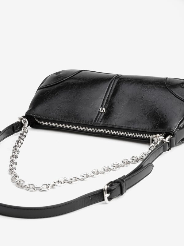Bolso pequeño, color negro, de textura grabada y acabado brillante. Modelo de diseño elegante con cierre superior de cremallera y correa larga, ajustable, para llevar como bandolera. Detalle de cadena metálica a modo decorativo.