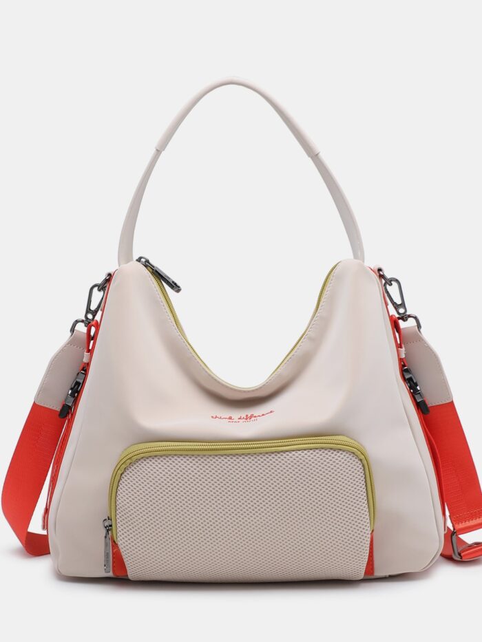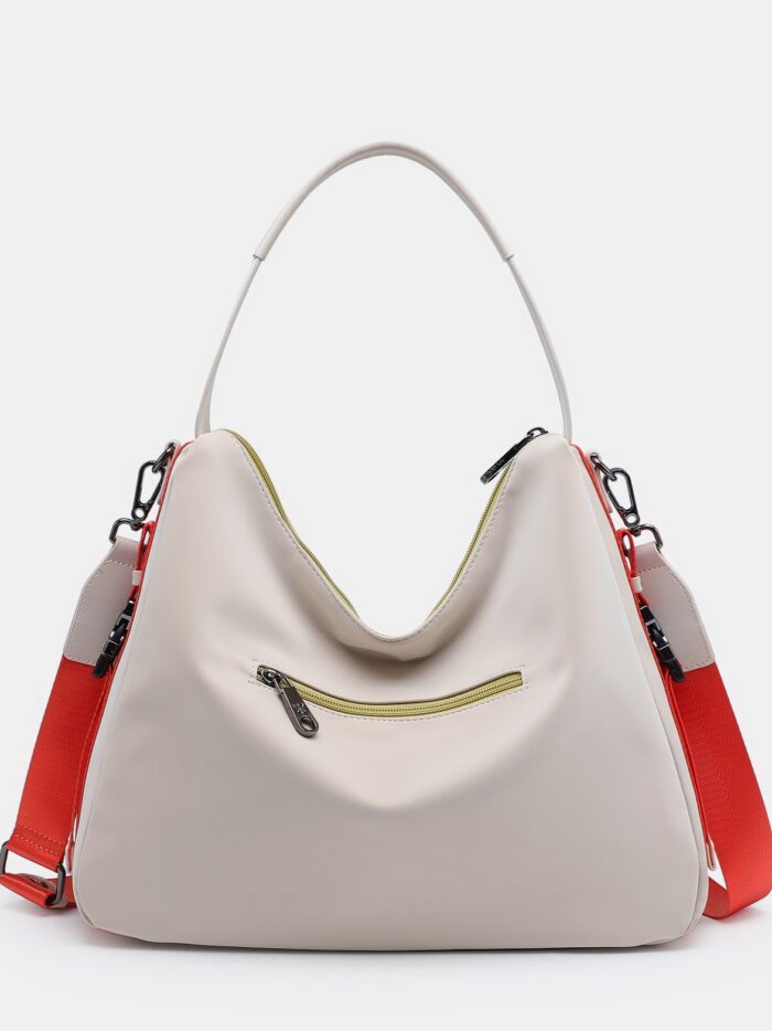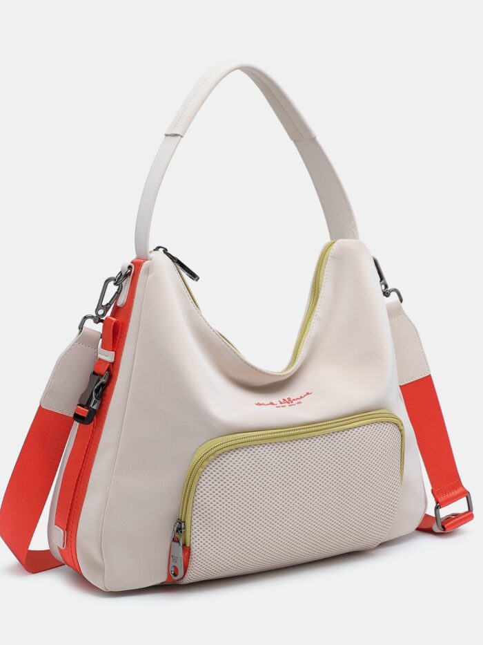 Bolso tamaño medio-grande de la firma Pepe Moll. Modelo de diseño juvenil y desenfadado con cierre principal de cremallera y dos correas para lucirlo: una corta para llevar al hombro y otra larga, ajustable y extraíble, para llevar de bandolera. Cuenta con dos bolsillos exteriores, uno por delante y otro por detrás, cerrados con cremallera. En su interior también dispone de dos bolsillos mas para organizar las cosa mas pequeñas. Su correa larga y los detalles laterales, en color naranja, aportan un toque colorido para lucirlo todo el verano.