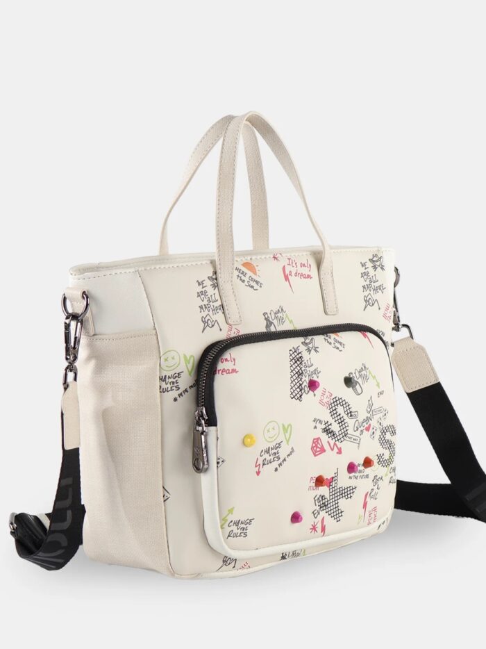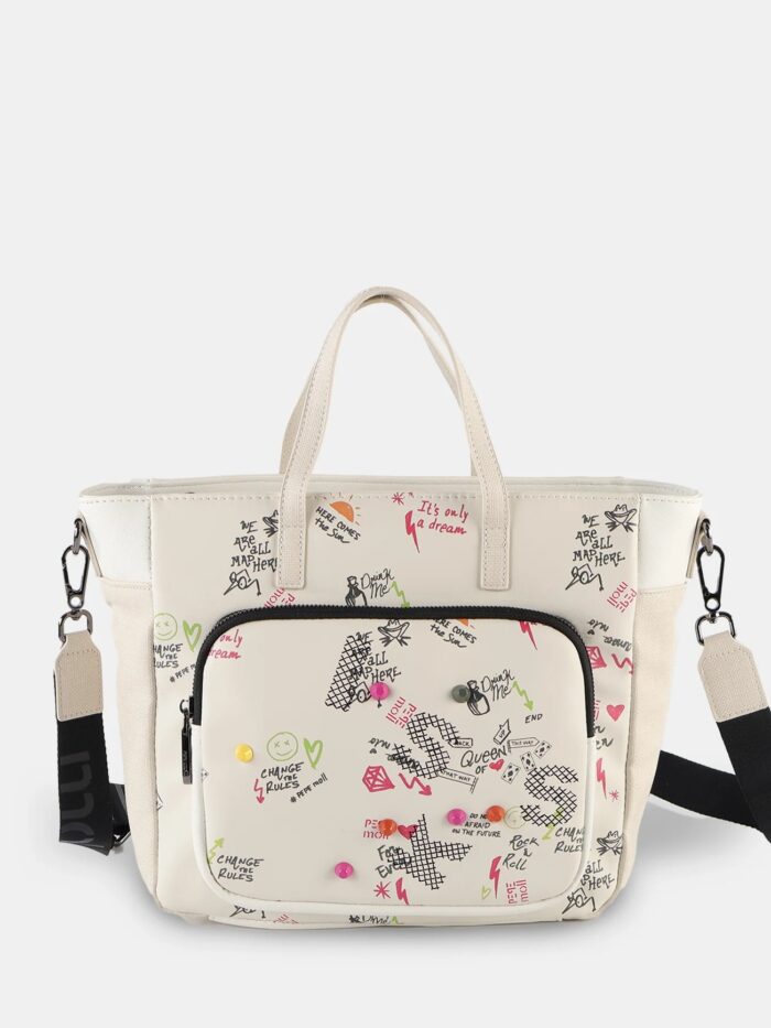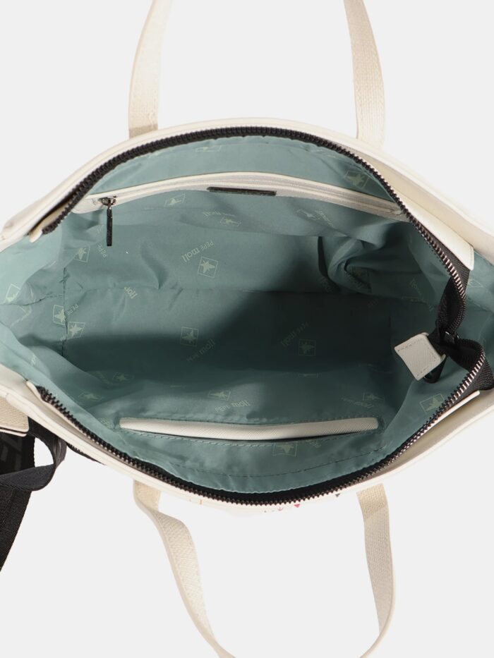 Bolso de mano de la firma Pepe Moll de diseño amplio y versátil pensado para tu día a día. Su diseño incorpora doble asa de mano para un agarre cómodo y una bandolera extraíble que te permite llevarlo también al hombro o cruzado. Su compartimento principal con cierre superior mantiene todo protegido, mientras que los bolsillos frontal y trasero añaden un extra de organización para que tengas siempre a mano lo que más utilizas.