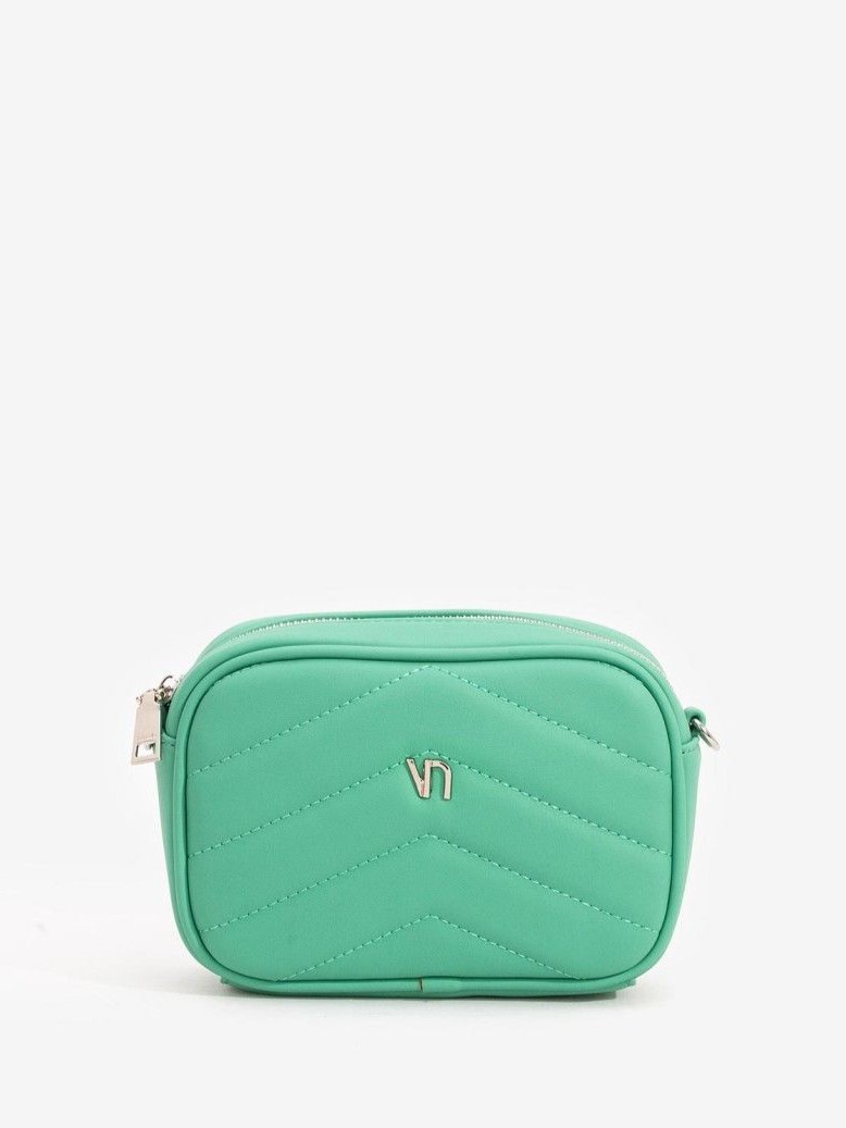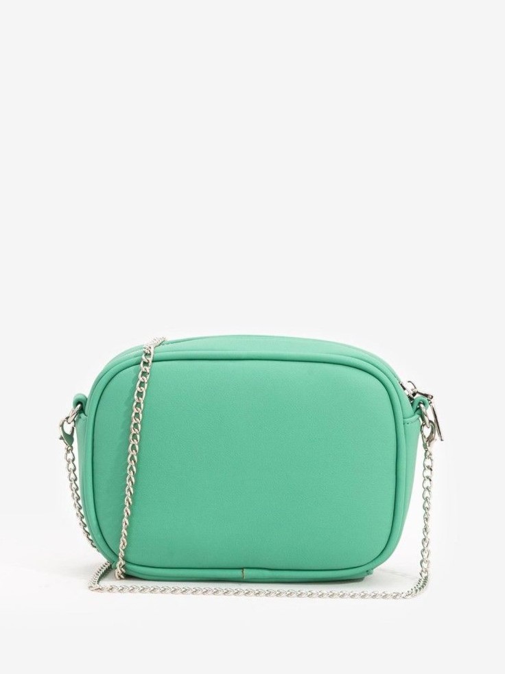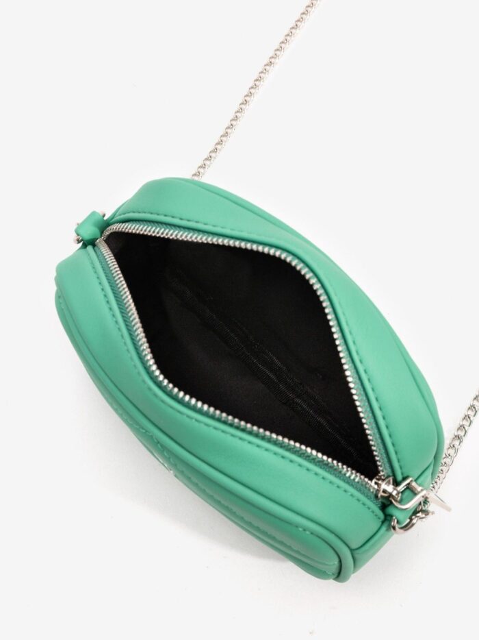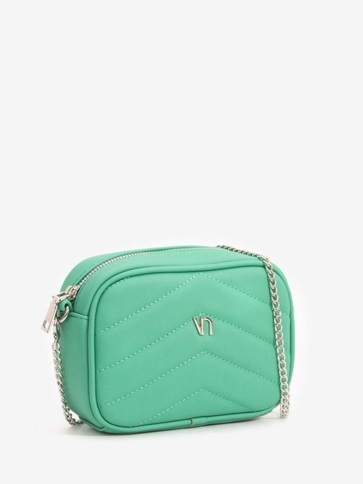 Bolso de tamaño pequeño y diseño acolchado con detalle de pespuntes en la parte de delante. Modelo con cierre superior de cremallera y cadena larga, extraíble, en tono plata, para llevar de bandolera.