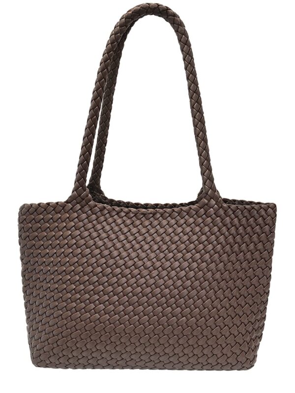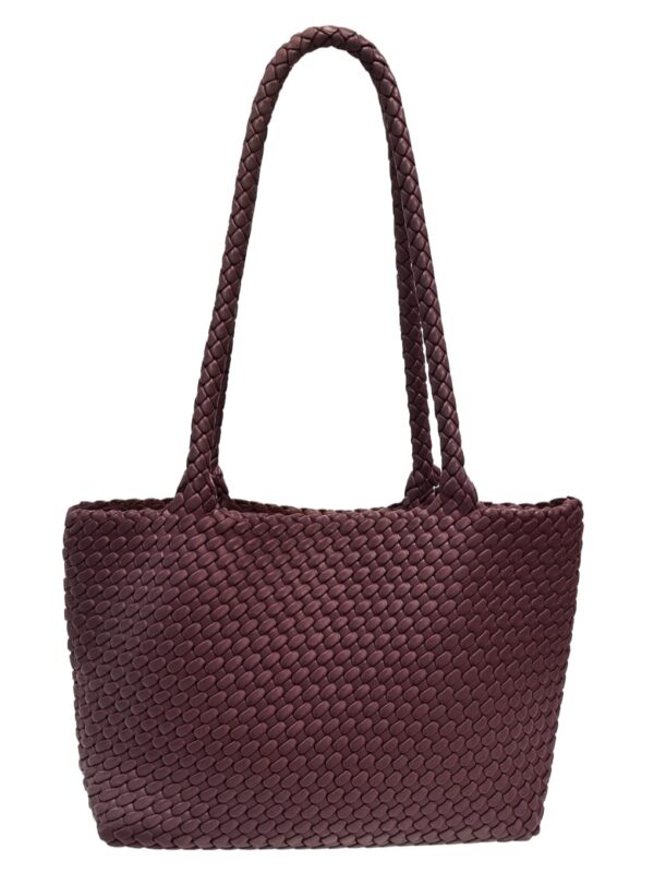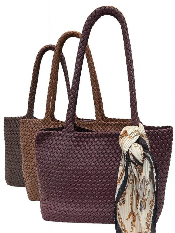 Bolso tipo shoper, tamaño medio, fabricado en sintético y diseñado con cuerpo y asas trenzadas. En su interior dispone de un bolso independiente, cerrado con cremallera, para llevar con seguridad las pertenencias mas importantes. Detalle de pañuelo cuadrado, de textura plisada, atado al asa pero que se puede quitar y llevar al gusto.