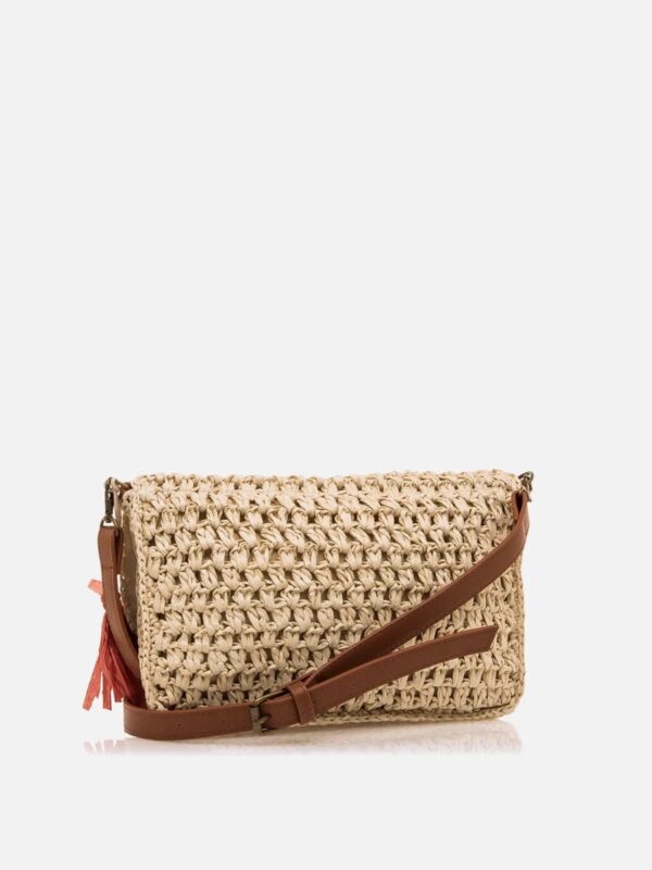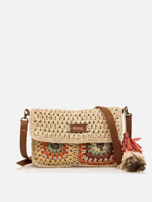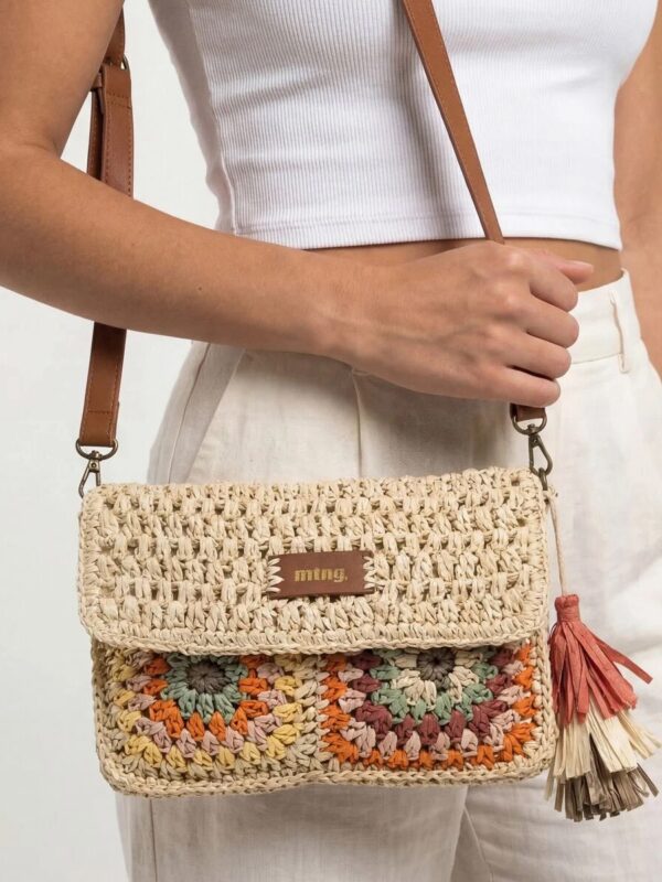 Bolso de tamaño pequeño, estilo bandolera, de la marca Mustang. Modelo fabricado en rafia en tono natural con mosaico floral multicolor y cierre superior de cremallera con solapa con cierre de botón magnético. Incluye una correa larga, ajustable, en tono cuero, y adorno de borlas laterales que le dan un aire artesanal y veraniego. Su interior va forrado y cuenta con un bolsillo auxiliar cerrado con cremallera para llevar lo mas pequeño y esencial durante los días de calor o escapadas informales.