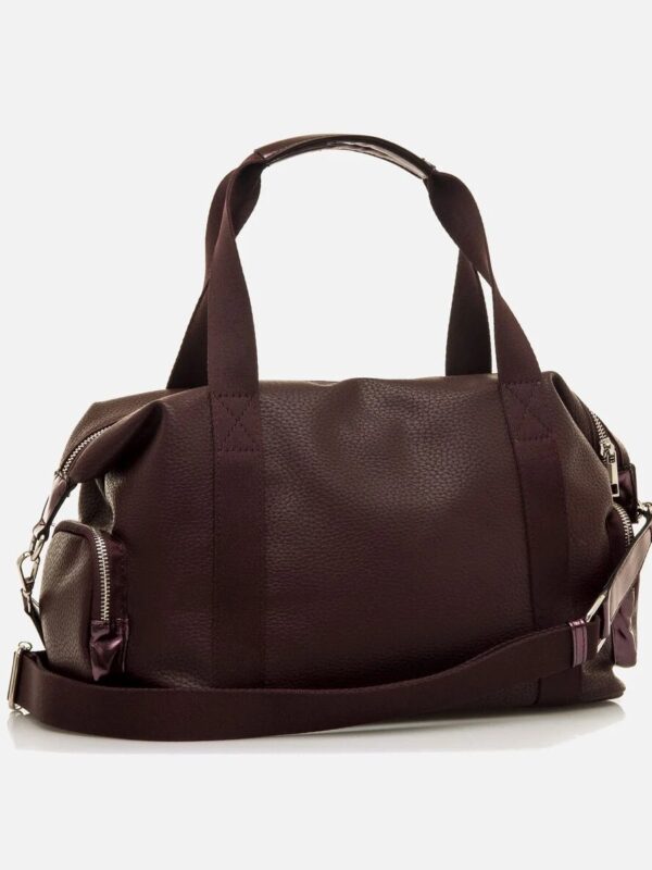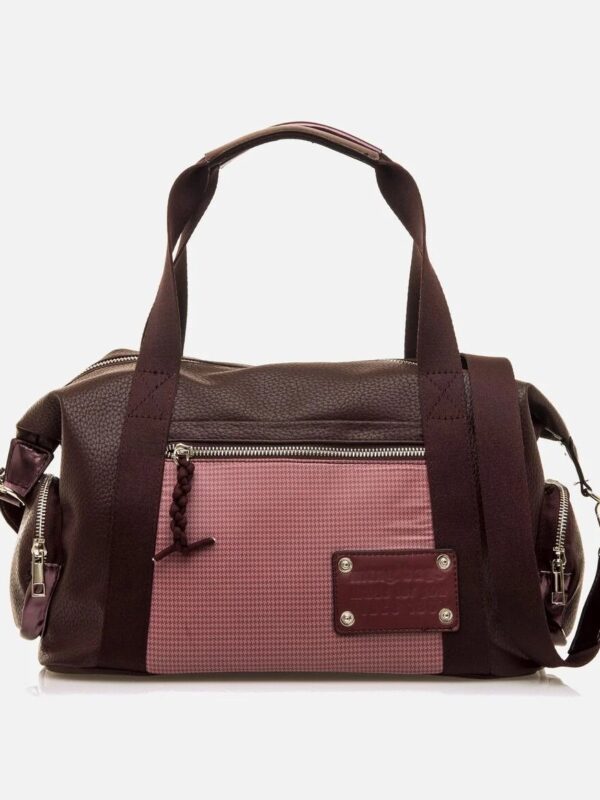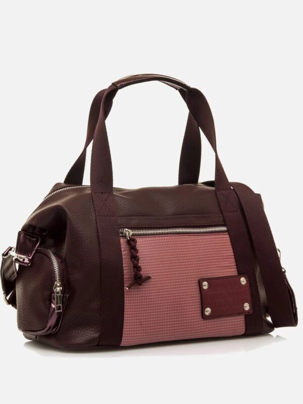 Bolso tipo bowling, de color burdeos, de la firma Mustang. Su diseño deportivo casual combina textura granulada con paneles de tejido en rosa y detalles metalizados en los extremos. Dispone de asas de mano, bandolera ajustable y múltiples bolsillos exteriores con cierre de cremallera para una organización funcional.