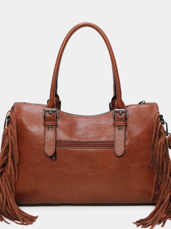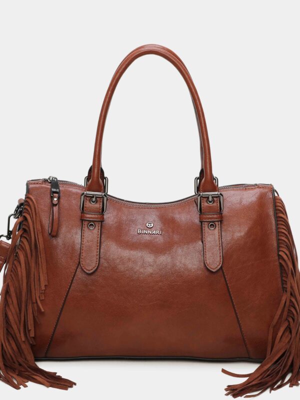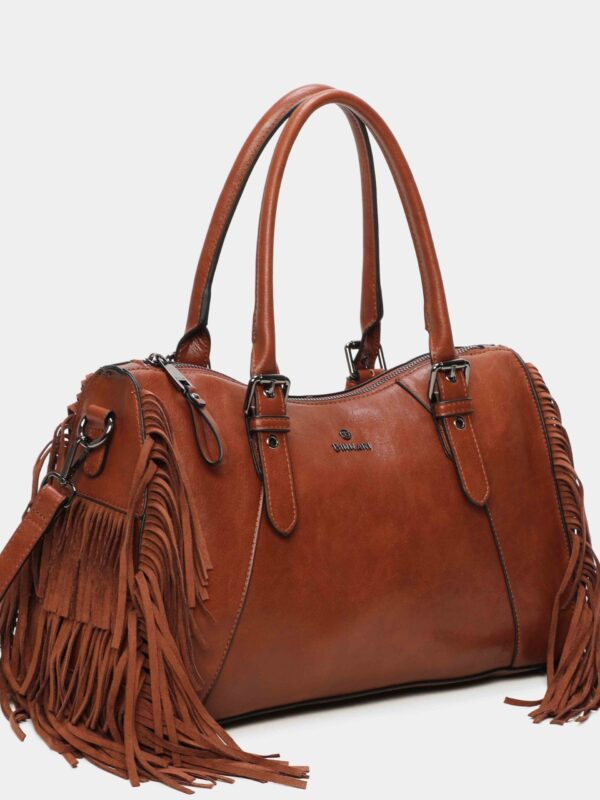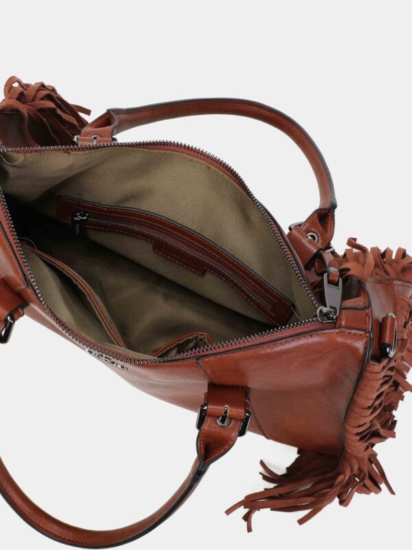 Bolso, tamaño medio, confeccionado en pu de alta calidad y flecos de antelina en los laterales. Modelo con cierre superior de cremallera y diseñado con dos asas cortas, regulables, para llevar en la mano o al brazo. En su interior encontramos 3 bolsillos, uno de ellos con cremallera, además de uno exterior en la parte de detrás. También cuenta con una correa larga ajustable mediante hebilla para regular el largo y poder lucirlo al hombro o bandolera.