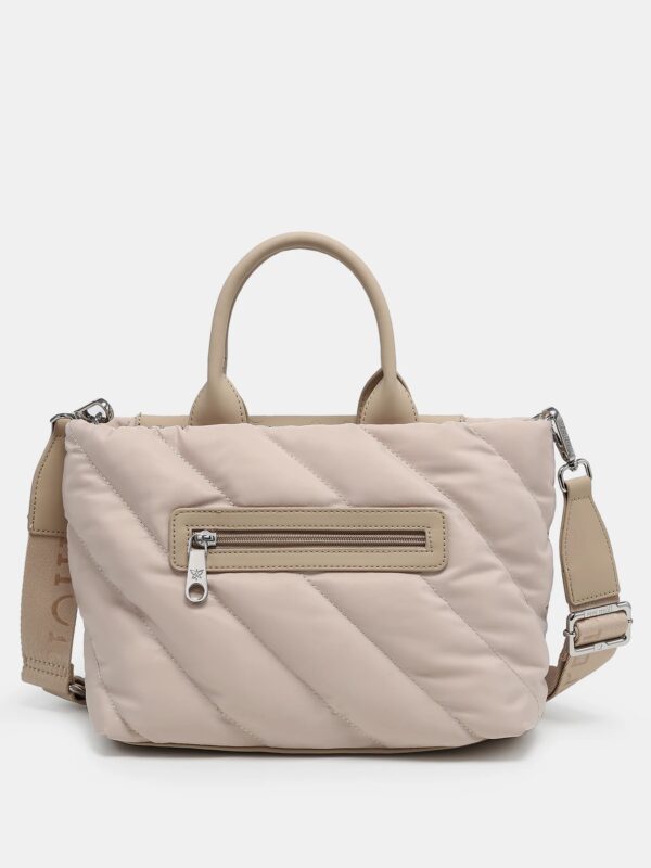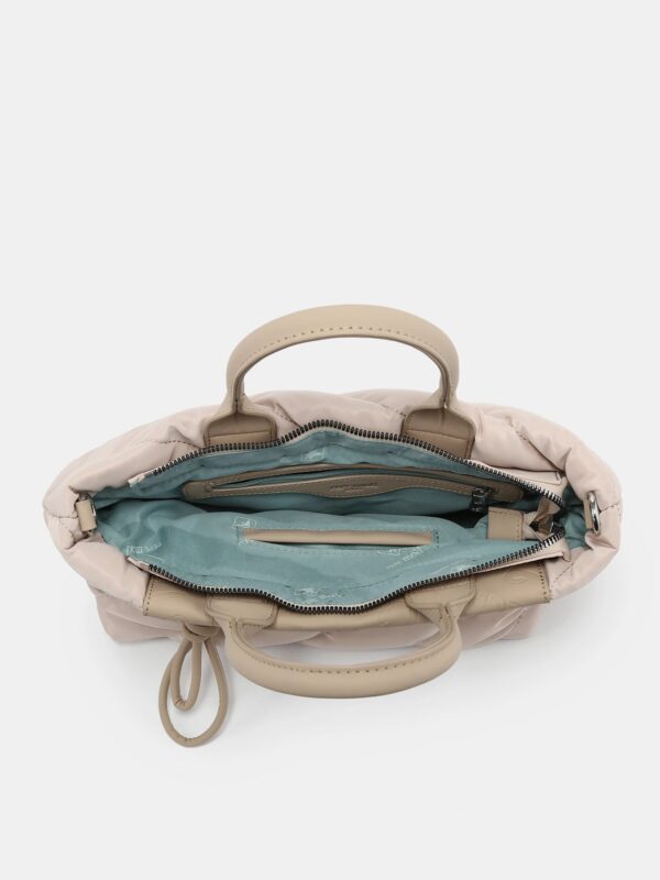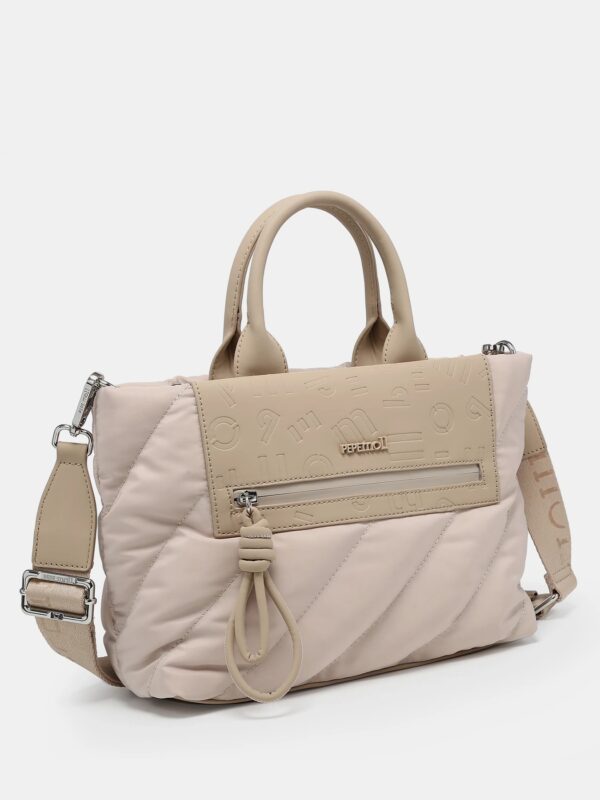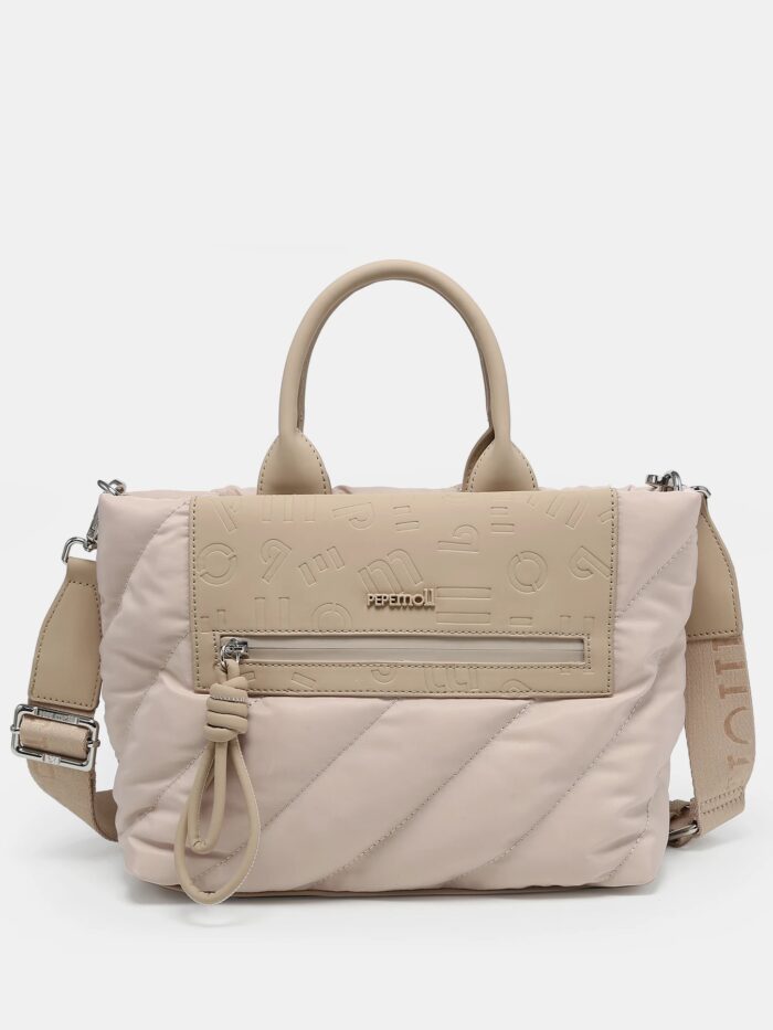 Bolso tamaño medio, de la firma Pepe Moll, fabricado en tejido de textura acolchada. Modelo diseñado con cierre superior de cremallera y dos asas cortas que permite llevarlo en la mano con total comodidad. Además dispone de una correa larga, ajustable y extraíble, para poder llevarlo de bandolera. Cuenta con dos bolsillo exteriores, uno por delante y otro en la trasera, y dos mas en su interior. Por su forma es ideal para disfrutarlo todos los días con cualquier look.