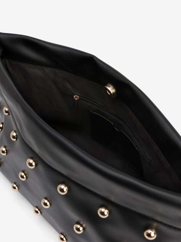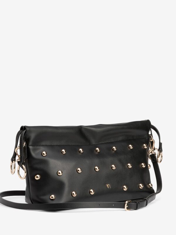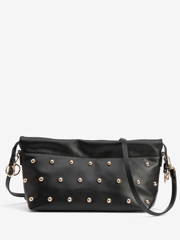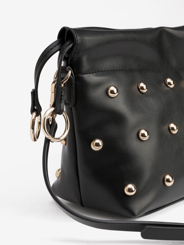 Bolso negro, con cierre superior mediante botón de imán, decorado con tachas de medias bolas doradas. Modelo de diseño elegante con correa larga, ajustable y extraíble, y bolsillo interior.