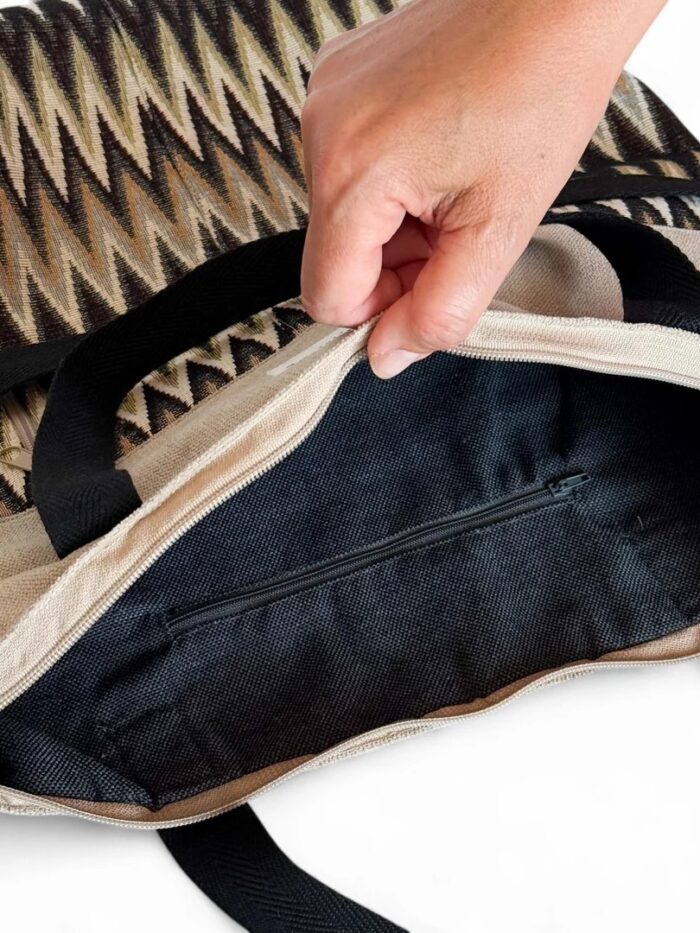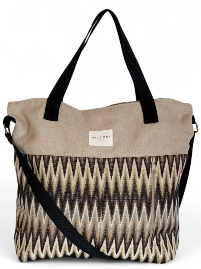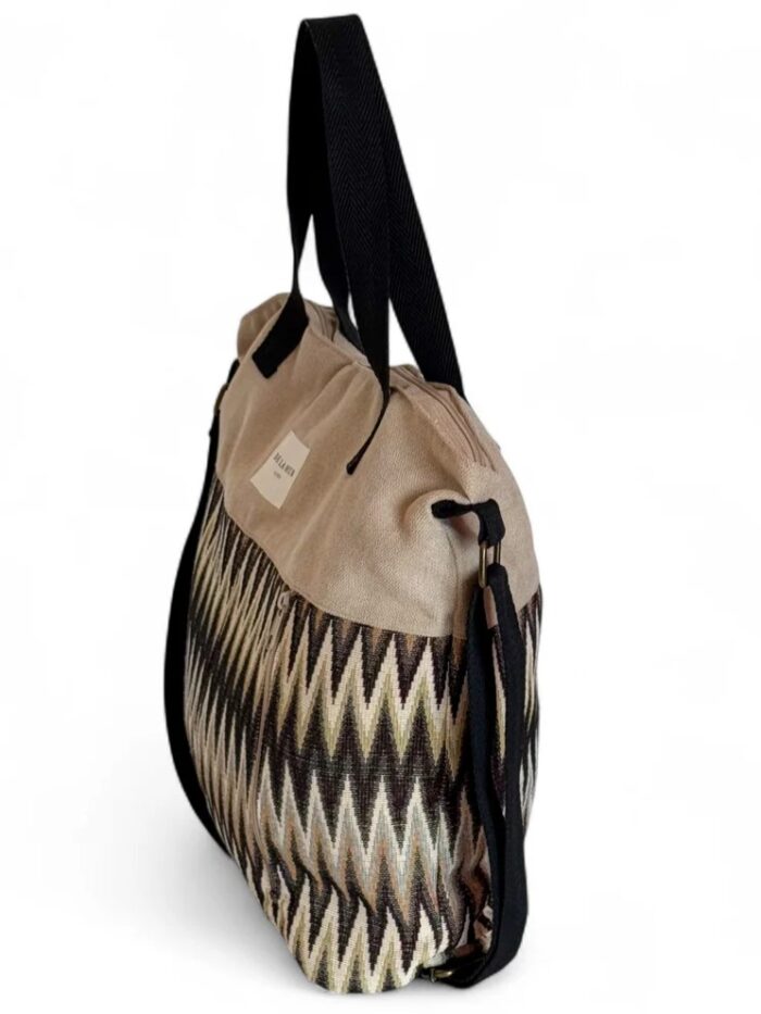 Bolso grande, con cierre superior con cremallera, y diseñado con dos asas medianas, para llevar al hombro, y asa larga, ajustable, para llevar de bandolera. Modelo fabricado con una combinación de dos tejidos diferentes, un tejido grueso tapicero de color beige en la parte superior y un tejido grueso de jacquard con estampado geométrico en tonos marrones y beige en la parte inferior. Cuenta con un bolsillo interior y otro exterior con cremallera. Confeccionado con telas nacionales.