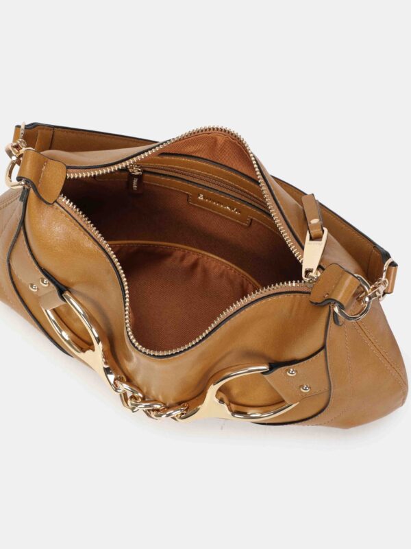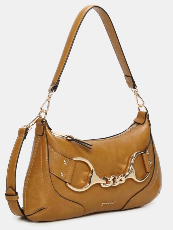 Bolso de tamaño pequeño, y formato tipo baguette, de la firma BINNARI. Modelo con un diseño estilizado y actual que Incluye una asa corta para llevarlo al hombro y una correa larga, ajustable y extraíble, para usarlo como bandolera. Dispone de un bolsillo exterior en la trasera, cerrado con cremallera, y dos mas en su interior para tener a mano las cosas mas pequeñas del día a día. Su detalle metálico frontal en tono oro aporta un toque elegante y distintivo. Un modelo cómodo, versátil y perfecto para completar cualquier look con estilo.