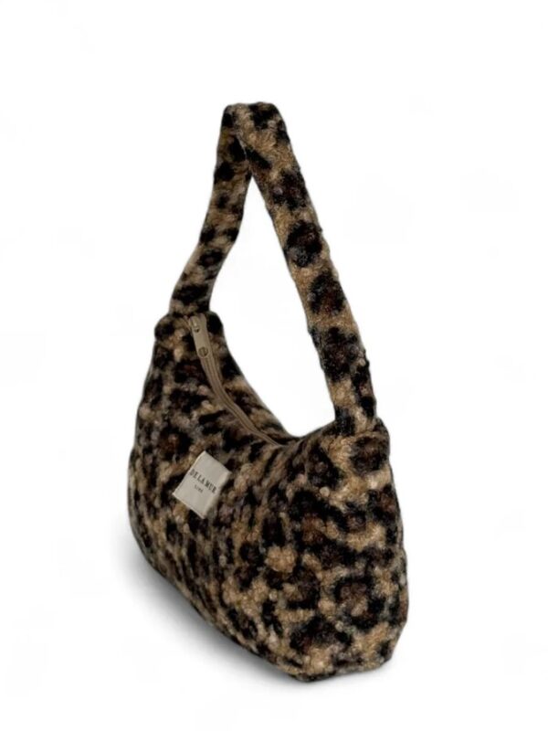 Bolso tamaño medio, con cierre superior con cremallera, y diseñado con una asa amplia para llevar al hombro. Modelo fabricado con un tejido grueso de borreguito con estampado de leopardo y forrado de tejido grueso de color gris en la parte interior y cuenta con un bolsillo interior. Confeccionado con telas nacionales.