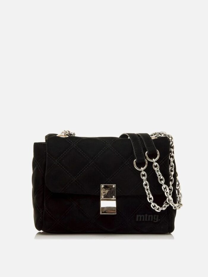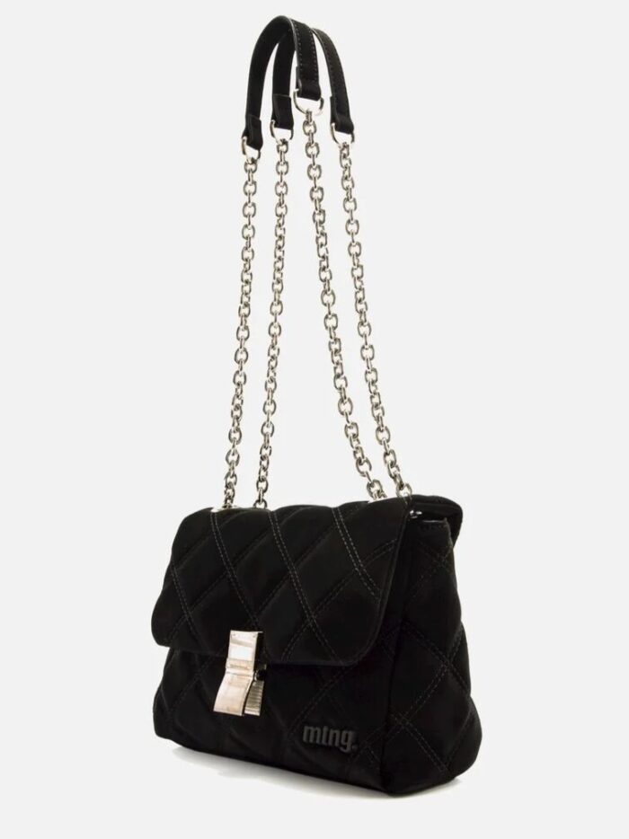 Bolso tipo bandolera de la marca Mustang. Modelo acolchado con pespuntes en forma de rombo, solapa frontal con cierre metálico y logo negro. Incorpora una doble cadena metálica con refuerzo para el hombro. Interior con compartimento principal forrado y bolsillo con cremallera para objetos pequeños.