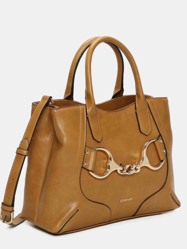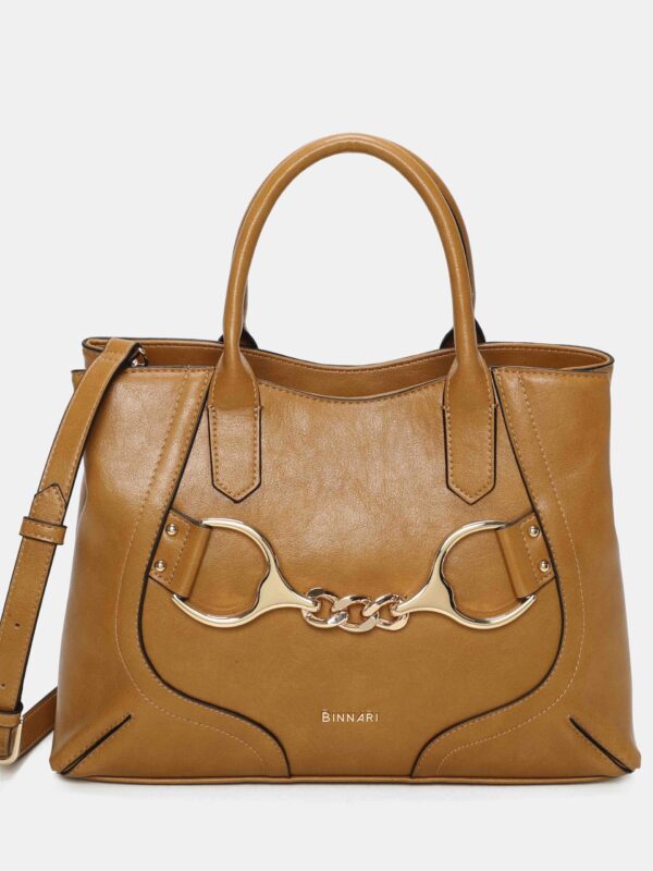 Bolso de tamaño medio-grande, confeccionado en PU de alta calidad, con un diseño sobrio y elegante. Este modelo cuenta con dos asas cortas para llevarlo en la mano o al brazo y una correa larga, extraíble y ajustable, para lucirlo al hombro o de bandolera. En su interior encontramos un compartimento amplio en el centro del bolso, cerrado con cremallera, además de tres bolsillos mas para organizar las cosa pequeñas del día a día. Su detalle metálico frontal en tono oro le aporta un toque sofisticado. Un bolso versátil, amplio y perfecto para acompañarte en tu día a día con estilo.