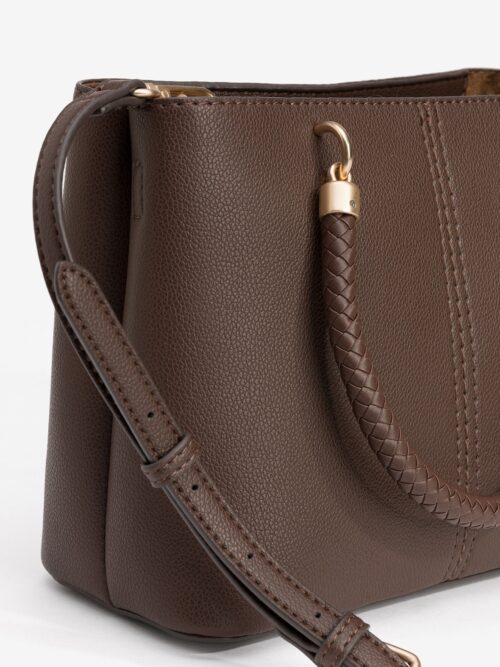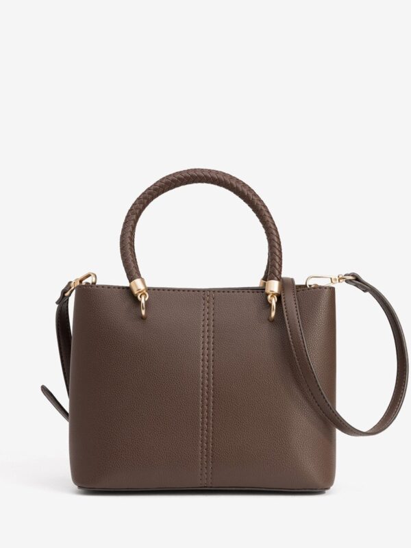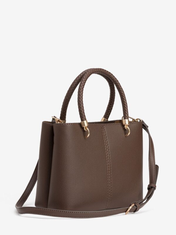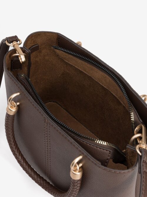 Bolso, tamaño pequeño, con cierre superior de cremallera. Diseñado con dos asas fijas, trenzadas, para llevar en la mano y también correa larga, desmontable y ajustable, para usar de bandolera.