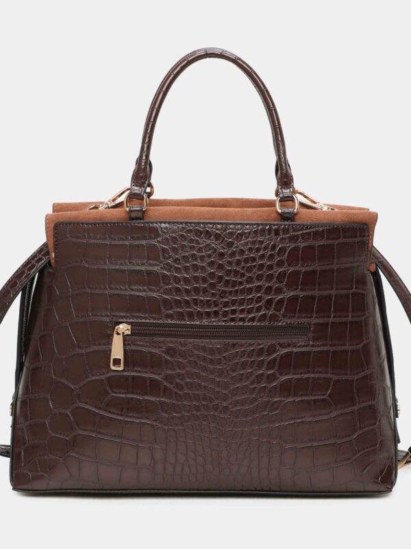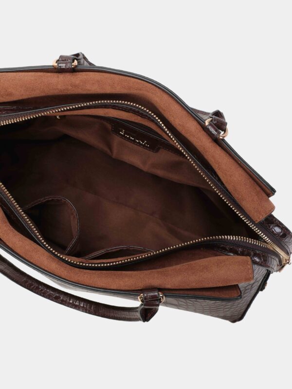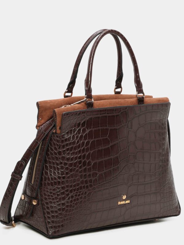 Bolso, tamaño medio-grande, de la firma Binnari, confeccionado en coco sintético y diseñado con cierre superior de cremallera. Cuenta con dos asa cortas para llevar de mano y también una larga, ajustable y extraíble, para poder llevarlo como bandolera. Dispone de un  bolsillo exterior, en la trasera, cerrado con cremallera y tres más en su interior.
