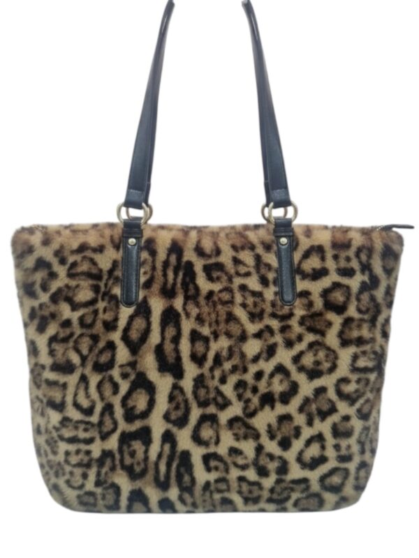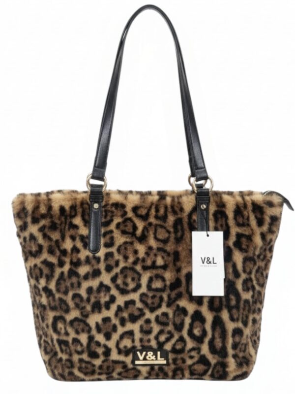 Bolso tamaño grande, de la firma Victorio & Lucchino, confeccionado en tejido de pelo, con estampación animal print, y diseñado con asas amplias para llevar al hombro. En su interior dispone de tres bolsillos, uno con cremallera, para organizar las cosas mas pequeñas del día a día. Detalle de logotipo de la marca en el frontal del bolso.