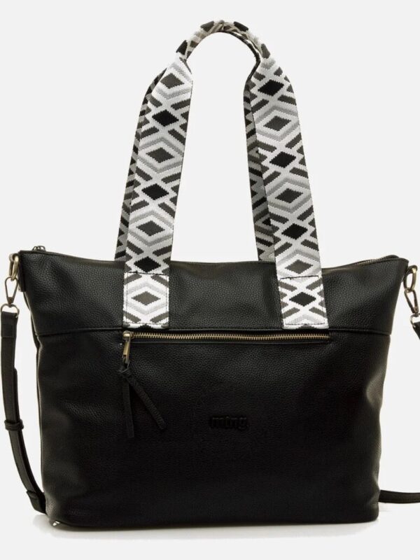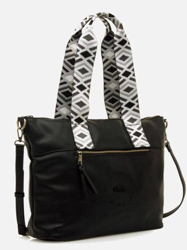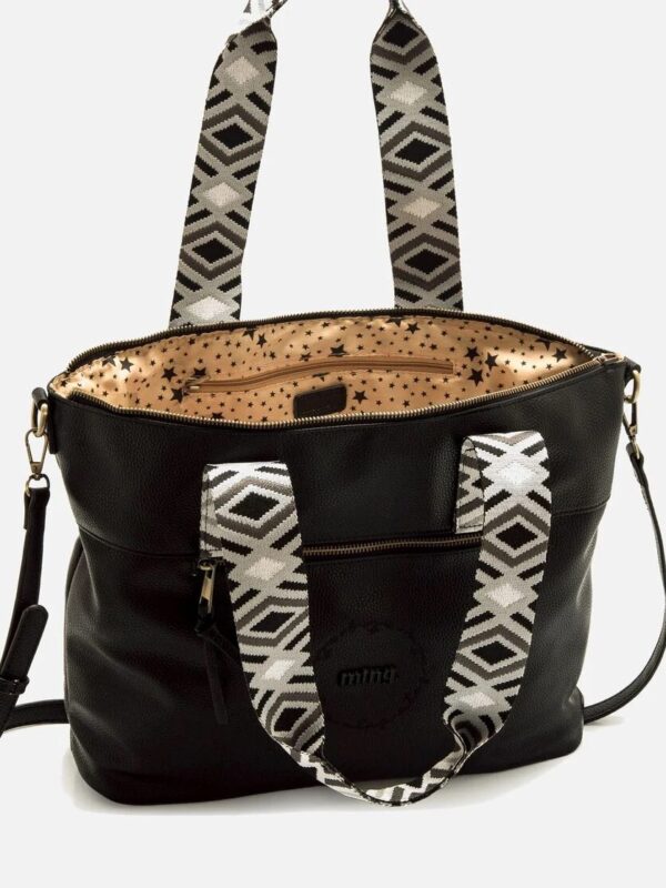 Bolso shopper, tamaño grande, de la firma Mustang. Modelo fabricado en sintético de textura granulada con asas largas de estampado geométrico. Incluye también una correa larga, ajustable, para poder usar como bandolera. Diseñado con cierre superior de cremallera y un bolsillo frontal, cuenta en su interior, con forro estampado de estrellas, con tres bolsillos mas, uno de ellos cerrado con cremallera.
