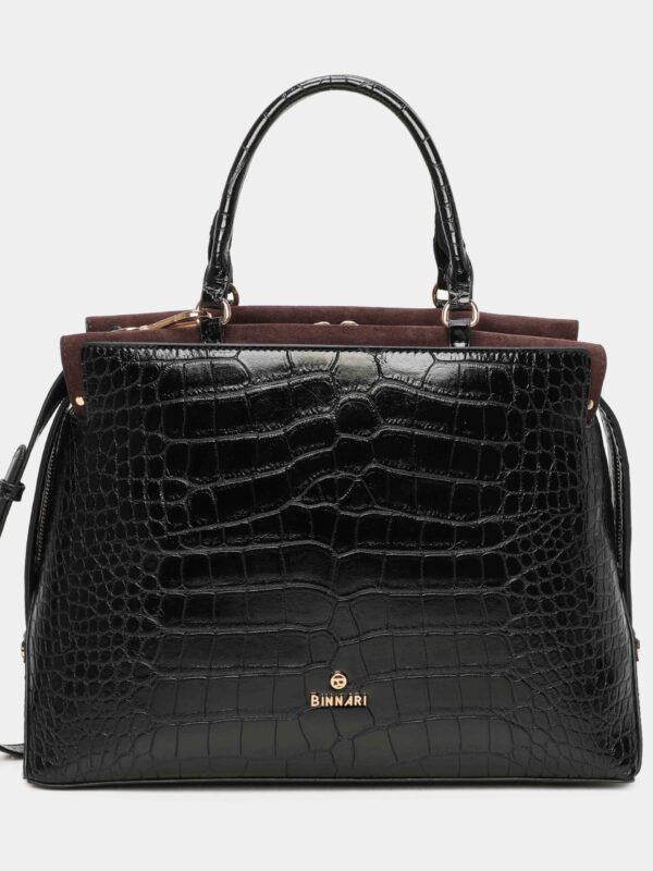 Bolso, tamaño medio-grande, de la firma Binnari, confeccionado en coco sintético y diseñado con cierre superior de cremallera. Cuenta con dos asa cortas para llevar de mano y también una larga, ajustable y extraíble, para poder llevarlo como bandolera. Dispone de un  bolsillo exterior, en la trasera, cerrado con cremallera y tres más en su interior.