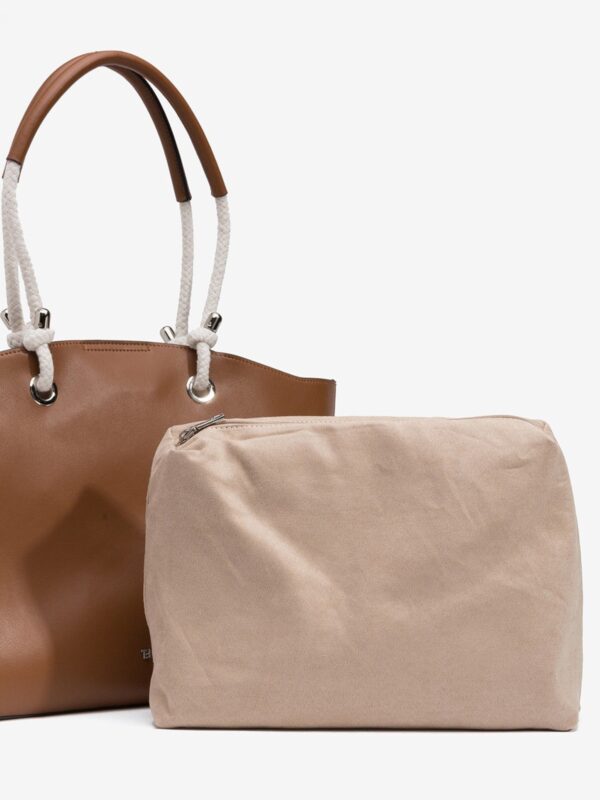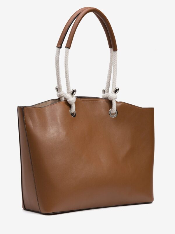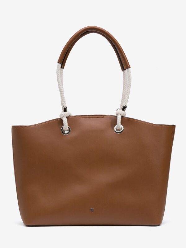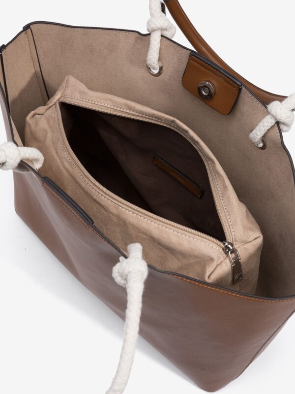 Bolso de tamaño grande, en color cuero, de la firma Tiffosi. Modelo diseñado con dos asas amplias de cuerda con refuerzo de pu para el apoyo en los hombros. En su interior encontramos una bolsa de tela, extraíble, para guardar las cosas mas importantes.