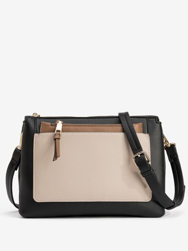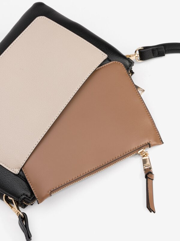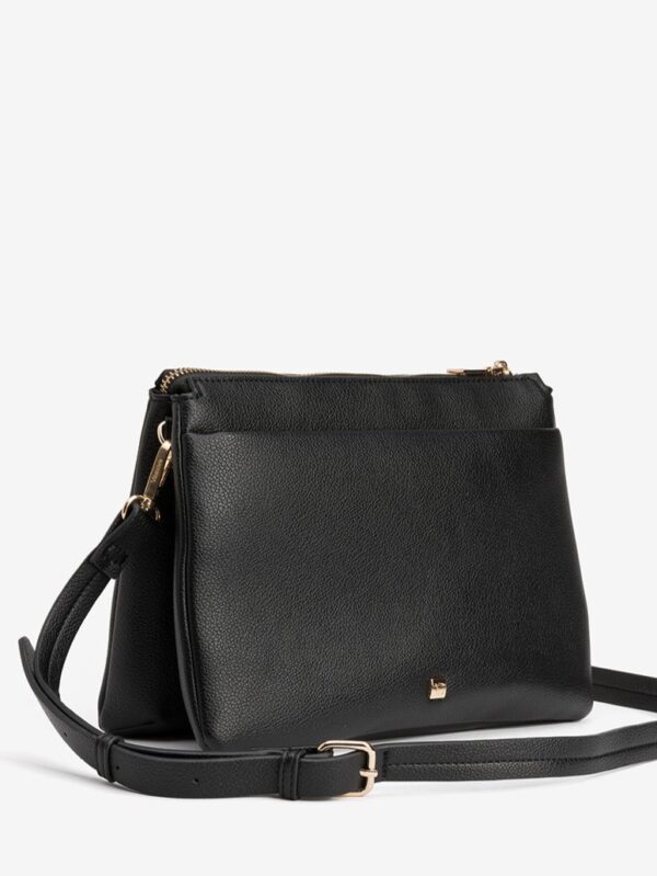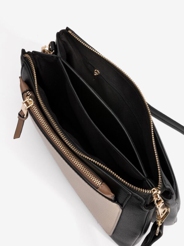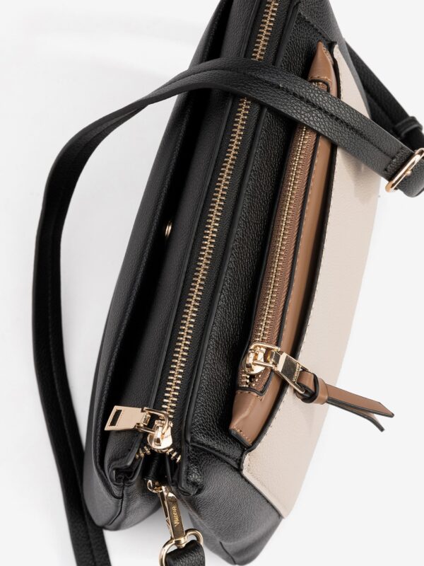 Bolso bandolera, tamaño pequeño, con cierre superior de cremallera y tres compartimentos interiores. Modelo diseñado con dos bolsillos exteriores: uno trasero con cierre magnético y otro, en la parte delantera, que incluye una cartera extraíble. La correa es ajustable y dispone de un bolsillo interior con cierre de cremallera.
