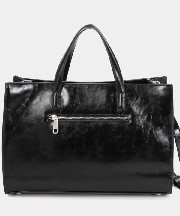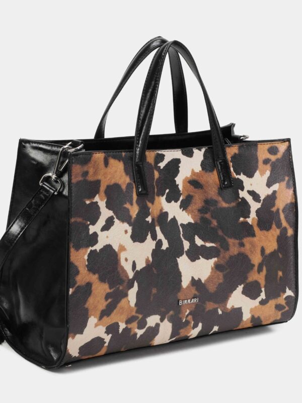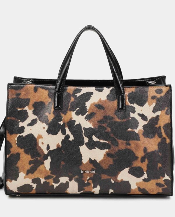 Bolso, tamaño grande, con forma rectangular y estampación animal, de apariencia vaca, en la parte delantera. Modelo diseñado con dos asas cortas para llevar de mano y otra correa larga, ajustable y extraíble, para llevar al hombro. Cuenta con un bolsillo exterior en la trasera, cerrado con cremallera, así como dos más en su interior.
