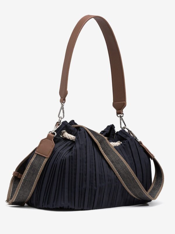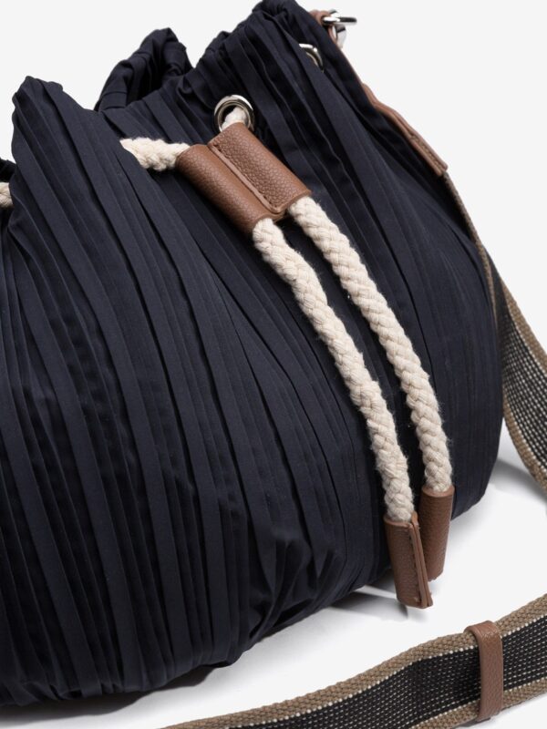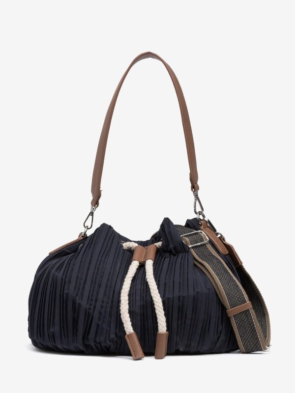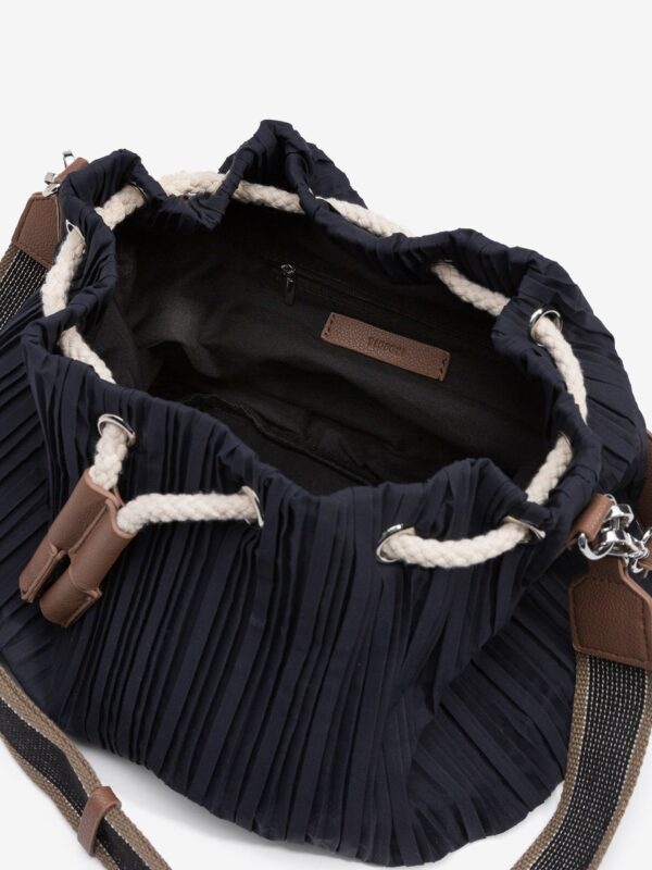 Bolso tipo bucket en azul escuro, con textura plisada, de la firma Tiffosi. Modelo con cierre superior de cuerda y diseñado con dos asas: una corta para llevar de mano y otra larga, regulable en el largo, para adaptarla y lucirlo de bandolera.